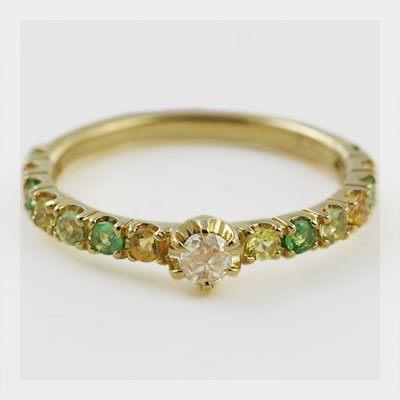 リング 【 仕様 】 ■本体素材[1]K18イエローゴールド製(サンプル=本体) [2]ローズカットダイヤモンド(約)3.0mm×1石 [3]濃いグリーンガーネット(約)2.0mm×3石 [4]薄いグリーンガーネット(約)2.0mm×2石 [5]ペリドット(約)2.0mm×3石 [6]カナリートルマリン(約)2.0mm×3石 [7]シトリン(約)2.0mm×3石 ■カラット [1]ローズカットダイヤモンド:(約)0.08ct ※カラットは多少の前後がございます。 ■サイズリング:直径:(約)16.4mm×厚:最小(約)1.5mm-最大(約)3.8mm×幅:最小(約)1.9mm-最大(約)4.4mm 重量:(約)2.25g ※サイズのお直しは±2までとさせていただきます。 ※サイズにより重さは異なります。 ※サンプルは11号です。■メモ【ベーネ・ベーネのお約束】ジュエリー工房<ベーネ・ベーネ>でお作りするジュエリーにはニッケルを一切使用してございません。ご安心して身に着けていただくことができます。【天然石の証】天然石を使用しているためルースには個体差がございます。カラー、内包物は石の性質により、写真と異なる場合があります。また、お客さまがお使いのモニターの設定により見え方が異なります。ご了承くださいませ。“ベーネ・ベーネ”では粗悪品の素材は一切扱っておりません。ご不明な点はQ&Aをご参考下さいませ。 ■必ずお読み下さいませ※ルースの品質についての考え方※宝石(ルース)は天然のものですので大小にかかわらず、インクルージョン(=内包物)は必ず入っています。粗悪品はもちろん扱っておりませんが、特にモース硬度の低い石には10倍ルーペで確認いただける微細なキズ(チップ)、欠けなどが混じる場合もございます。ベーネ・ベーネでは宝飾のプロという観点からも、肉眼で認識の困難なキズ、欠けよりも全体の色味、輝きなど宝石としての品位に重点を置いてセレクションを行っております。以上を理由とする交換、または返品はお受けできません。ご了承くださいませ。※ページ写真についてサンプル撮影ではなるべく実物に近くなるよう留意しておりますが、撮影環境、天気、照明により実物と見え方が異なる場合がございます。何とぞご理解下さいますようお願いいたします。以上を理由とする交換、または返品はお受けできません。ご了承くださいませ。 Q&Aよくあるご質問※同梱発送についてのお願い※先にご購入頂いた支払い方法とと2回目以降のお支払い方法が異なる場合は、システムの都合上、同梱発送をお受けすることができません。ご注意くださいませ。 側面 スタンダードのストレートリングにローズカットダイヤを合わせた贅沢なデザイン。 裏面 指あたりを考慮して角を丸く仕上げ長時間装着のストレスを感じさせない作り。 うえからリングの半分以上をルースで敷き詰めているのでクルッと回っても平気! アップセンターに品格あるローズカットダイヤを添えて上品な風合いを出しました。 アームビタミンカラーのルースを並べたリズミカルなグラデーションが指先を明るく彩ります。 ピンクゴールド ※カラーストーンは撮影環境(室内、室外)により色の見え方に違いが出ます。※どちらも同一のサンプルを使用しています。 ■対応金種:K18イエローゴールド、K18ピンクゴールド、K18シャンパンゴールド、K18グリーンゴールド、K10イエローゴールド、K10ピンクゴールド、プラチナ900※グリーンゴールドはピアスポスト、キャッチはK18イエローゴールド仕様となります※チェーンはカットボールチェーンのみグリーンゴールド対応可能です 116,380円 税込 送料込 カードOK レビュー1件 ベーネ・ベーネ ![]() | ||