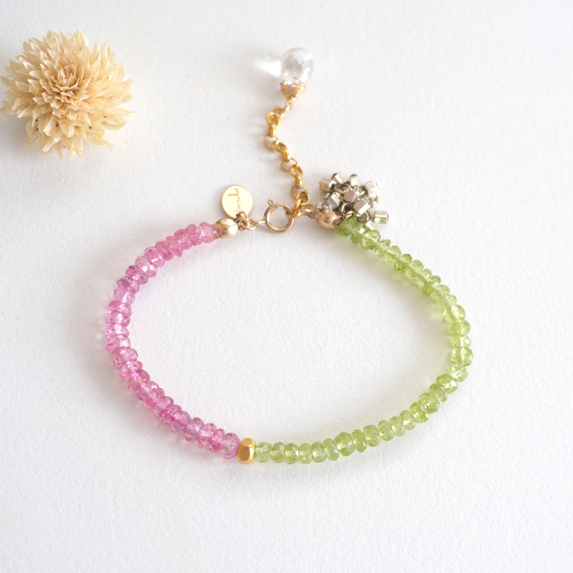 商品説明 グリーンの天然石ペリドットとピンクの天然石ピンクトパーズを連ねた可愛いブレスレットです。 ゴールドビーズやアンティークビーズのポンポンがアクセントに飾られています。 アジャスターチェーンの先にはドロップ型のクォーツがあしらわれています。 金具にはゴールドフィルドを使用。高級感があり、金属アレルギーの方にも大変人気の素材です。 プレゼントにも便利なブランドの可愛いBOX付きです。 素 材 ペリドット、ピンクトパーズ (コーティング加工)、クォーツ、14kgf... 8,800円 税込 送料別 カードOK ラブリ ![]() | ||