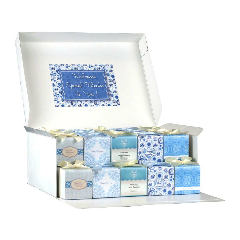 ふたを開けると、爽やかなブルートーンの小箱がずらりと並ぶ「ハッピーブルーミング」ギフトセット。 花柄・タイル柄・レース柄など、上品で洗練された5種類のデザインをアソートで詰め合わせました。 箱の内側には、ブルーで統一された“Welcome Special Thanks to You” のメッセージ付き。 受付に置くと一気に華やぎ、ゲストへのおもてなし感がアップします。 ひとつひとつの小箱には、ハートパイ、ハートクッキー、キラキラチョコなど、 ちょっと贅沢なお菓子の詰め合わせ入り。 ... 7,780円 税込 送料別 カードOK プチギフト専門店 ココサブ ![]() | ||
