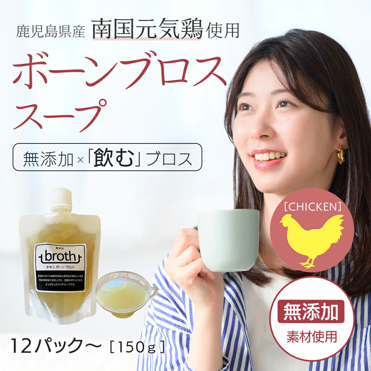 九州のブロス製造所の敷地内で飼育管理した南国元気鶏(無薬鶏)の親鶏の中抜きと、若鶏の肉つきガラを使用。薬を使わずに育てた鶏を、冷凍せずにとてもフレッシュな状態で加工する為、臭みが全くありません。現地の美味しい水で強力な火力でじっくり炊き上げ、調合窯で加熱殺菌、研究室で成分分析を行い、現在特許申請中の特注常圧釜で煮込むことで出来上がります。香味野菜も一切不使用ですから、赤ちゃんやペットにも安心してどうぞ。 食品添加物不使用 【栄養成分】(100g中) エネルギー・・・14kcal タンパク質・・・3.2g 脂質・・・0.1g 炭水化物・・・0.0g 食塩相当量・・・0.4g 150g入り×12 袋 or 150g入り×24 袋 冷凍 原材料;鶏骨(九州産)、鶏肉(九州産)、食塩(沖縄北谷の塩) 賞味期限:1年以内 5,890円 税込 送料込 カードOK レビュー2件 bone_broth_japan ![]() | ||