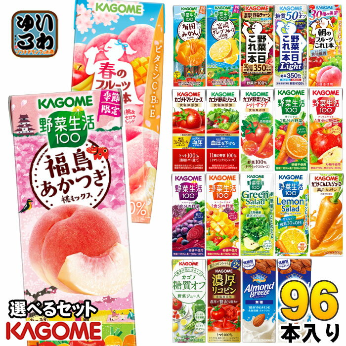【バリエーションは下記をクリック】・選べる 24本・選べる 48本 (24本×2)・選べる 72本 (24本×3)・選べる 96本 (24本×4)【一個あたり 113円(税込)】■ 毎日飲む野菜ジュースだから、選べるまとめ買い毎日飲む野菜ジュースだからこそ、味の好みや飲む人に合わせて選べることを大切にしました。本商品は、カゴメの紙パック野菜ジュースを、お好みに合わせてケース単位で選べるまとめ買いセットです。選んだ商品がケース単位で届くため、飲まない味が入ってしまう心配がなく、毎日の習慣として続けやすいのが特長です。■ 選べるセット内容についてカゴメの紙パックシリーズを、1ケース24本入りを4ケース、合計96本お選びいただけます。ケース単位で選べるため、ご家庭用・職場用・家族での飲み分けなど、用途に合わせた組み合わせが可能です。※ 本商品は詰め合わせではありません■ こんな方におすすめです毎日1本、野菜ジュースを飲む習慣がある方。家族それぞれで好みの味が違うご家庭。まとめ買いで買い忘れを防ぎたい方。カゴメの野菜ジュースを継続して飲みたい方。価格だけでなく、続けやすさや失敗しにくさを重視したい方におすすめです。■ 紙パックだから続けやすい理由200ml前後の紙パックタイプは、冷蔵庫で保管しやすく、持ち運びもしやすいサイズです。朝食時や仕事の合間、食事と一緒など、日常のさまざまなシーンで手軽に取り入れられます。■ 選べる種類一覧(紙パック195ml・200ml)・野菜生活100 有田みかんミックス 195ml・野菜生活100 宮崎月夜実グレープフルーツ&日向夏ミックス 195ml・野菜生活100 福島あかつき桃ミックス 195ml・春のフルーツこれ1本 白桃&アセロラブレンド 200ml・野菜一日これ一本 200ml・野菜一日これ一本 Light 200ml・朝のフルーツこれ一本 200ml・トマトジュース 食塩無添加 200ml・野菜ジュース 食塩無添加 200ml・野菜ジュース トマトサラダ 食塩無添加 200ml・野菜生活100 オリジナル 200ml・野菜生活100 アップルサラダ 200ml・野菜生活100 ベリーサラダ 200ml・野菜生活100 マンゴーサラダ 200ml・野菜生活100 グリーンサラダ 200ml・野菜生活100 すっきりレモンサラダ 200ml・にんじんジュース 高β-カロテン 200ml・糖質オフ 野菜ジュース 200ml・濃厚リコピン 195ml・アーモンド・ブリーズ 無糖 200ml・アーモンド・ブリーズ 微糖 200ml■ 各商品の特長について・野菜生活100 有田みかんミックス 有田みかんの甘さが楽しめる野菜・果実ミックス・野菜生活100 宮崎月夜実グレープフルーツ&日向夏ミックス 宮崎県産果実を使用したバランスのよい味わい・野菜生活100 福島あかつき桃ミックスしっかりとした甘さと程よい酸味・春のフルーツこれ1本 白桃&アセロラブレンド 白桃の甘みとアセロラの酸味が楽しめる春限定・野菜一日これ一本 30品目の野菜350g分を使用した野菜汁100%・野菜一日これ一本 Light 30品目の野菜を使用した糖質50%オフタイプ・朝のフルーツこれ一本 健康果実30品目を使用・トマトジュース 食塩無添加(機能性表示食品) トマト100%、食塩無添加・野菜ジュース 食塩無添加(機能性表示食品) 11種の野菜を使用した野菜100%・野菜ジュース トマトサラダ 食塩無添加 4種の野菜を使用した野菜100%・野菜生活100 オリジナル 20種の野菜と3種の果実を使用・野菜生活100 アップルサラダ 赤の野菜と果実を使用した味わい・野菜生活100 ベリーサラダ 紫の野菜と果実を使用・野菜生活100 マンゴーサラダ 黄色の野菜と果実を使用・野菜生活100 グリーンサラダ プチヴェール配合、すっきりした後味・野菜生活100 すっきりレモンサラダ 糖質30%オフ、甘くない味わい・にんじんジュース 高β-カロテン にんじんのみを使用・糖質オフ 野菜ジュース 糖質を抑えた野菜ジュース・濃厚リコピン(機能性表示食品) 完熟トマトを濃縮したトマト100%飲料・アーモンド・ブリーズ 無糖 契約農園アーモンド使用の無糖アーモンドミルク・アーモンド・ブリーズ 微糖 香ばしいアーモンドの風味が楽しめる微糖タイプ【広告文責】 株式会社ナカヱ 050-3786-3286【メーカー名】 カゴメ株式会社【製造国】 日本製【商品区分】 機能性表示食品■ まとめ買いだから安心して続けられるケース単位で選べるまとめ買いセットのため、必要な商品だけを無駄なくストックでき、毎日の習慣として続けやすいセットです。毎日飲む方はもちろん、家族で飲み分けたい方や、買い忘れを防ぎたい方にも選ばれているセットです。【変更事項】ページリニューアル日:2026/02/13変更内容:商品追加 「福島あかつき桃ミックス」※北海道・沖縄県・離島(一部)へのお届けは決済時に送料無料となっていても追加送料が必要です。(コカ・コーラ直送を除く)北海道1個口 715円(税込)、沖縄県1個口 2420円(税込)※離島・一部地域は追加送料がかかる場合があります。追加送料の詳細は注文確定メールにてご案内いたします。※本商品はご注文タイミングやご注文内容によっては、購入履歴からのご注文キャンセル、修正を受け付けることができない場合がござい