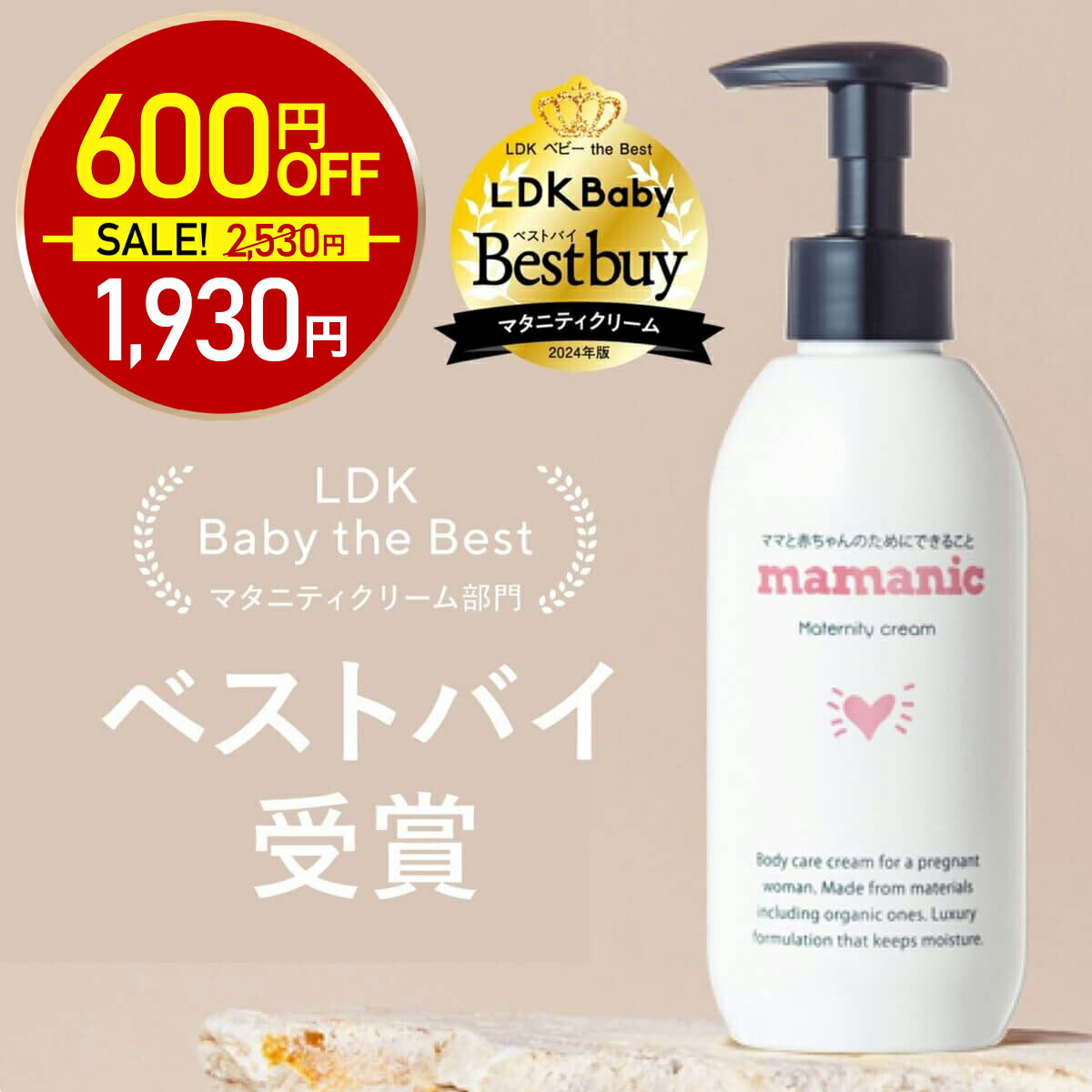 ご購入合計金額が5,400円(税込)以上で代引手数料無料 ※宅配業者はご選択いただけません。 特徴 【LDKbabyベストバイ受賞の「ママニック マタニティクリーム 120g」がリニューアル!内容量が120g→200gへ大幅アップ】シリーズ累計800,000個突破!(※)。40年以上のスキンケア研究から誕生したママニックの保湿ケアクリームです。配合成分がグレードアップし、保湿のみでは足りない妊婦さんの肌トラブルに、「保湿+弾力・柔軟性」の成分でお肌を整えます。※2022年11月実績(自社調査) 【97%天然由来成分】妊娠中のスキンケアに大事なのは「柔軟・弾力・潤い」。乾燥に負けない柔らかく弾力のある肌へ導くアーモンドオイルやカハイオイル、高い保湿力でしっとりもっちりが続く3種のヒアルロン酸やコラーゲンアミノ酸、お肌を整えて守るCICA(ツボクサエキス)や天然ヒト型セラミド、復活の木エキスなどの成分を配合しました。 【こだわりの使い心地】伸びが良くベタつかい使用感で、塗った後はしっとり潤い肌へ。つわり中もリフレッシュできるように、ほのかに香るベルガモットの香りで心地よいリラックスタイムに。 商品名 ママニック マタニティクリーム 内容量 200g 成分 水、グリセリン、トリ(カプリル酸/カプリン酸)グリセリル、BG、ペンチレングリコール、ポリアクリルアミド、セラミドNP、セラミドNG、セラミドAP、ツボクサ葉エキス、ミロタムヌスフラベリフォリア葉/茎エキス、3−O−エチルアスコルビン酸、グリチルリチン酸2K、アセチルヒアルロン酸Na、加水分解ヒアルロン酸、ヒアルロン酸Na、コラーゲンアミノ酸、プセウドジマエピコラ/(ダイズ粉/アルガニアスピノサ核油)発酵液、カンゾウ根エキス、キュウリ果実エキス、トウキンセンカ花エキス、カミツレ花エキス、タチジャコウソウ花/葉エキス、アーモンド油、カリオデンドロンオリノセンセ種子油、ホホバ種子油、タウリン、リシンHCl、アラニン、ヒスチジンHCl、アルギニン、セリン、プロリン、グルタミン酸、トレオニン、バリン、ロイシン、グリシン、アラントイン、イソロイシン、フェニルアラニン、ベルガモット果皮油、水添ポリイソブテン、水添レシチン、フィトステロールズ、トコフェロール、アスコルビン酸、クエン酸、プロパンジオール、ラウレス−7、ジメチコン、フェノキシエタノール ご使用方法 手のひらに適量(500円玉大)を取り、お腹周りなど気になる部分になじませるようにご使用ください。最初にお使いになる時は、ポンプ部分のストッパーを外し、数回空押ししてください。 ご使用上の注意 ○お肌に異常が生じていないかよく注意してご使用ください。 ○使用中や使用後に直射日光にあたって赤み、はれ、かゆみ、刺激、色抜け(白斑等)や黒ずみ等の異常があらわれた時は、使用を中止して皮膚科専門医等にご相談されることをおすすめします。 ○傷、はれもの、湿疹等の異常のある部位にはお使いにならないでください。 ○乳幼児の届かないところに保管してください。 ○極端に高温の場所、または低温の場所、直射日光のあたる場所には保管しないでください。 ○天然由来原料を使用しておりますので、におい、色調などの変化が生じる場合がございますが、使用には問題ございません。 販売元 レバンテ株式会社 区分 日本製/化粧品 広告文責 レバンテ株式会社 0120-737-111 ※効果の実感には個人差がございます事を予めご了承下さいませ。\ 新規お友だち登録で今すぐ使える /★この商品をお気に入り登録する≫ セール会場はこちら ≪ 1,930円 税込 送料込 カードOK レビュー811件 美と健康のレバンテ楽天市場店 ![]() | ||