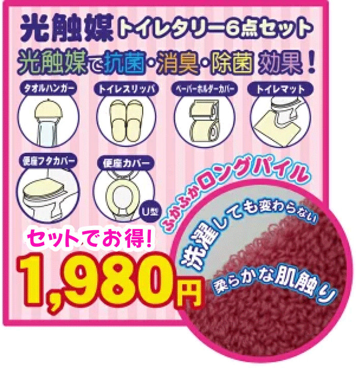 【セット内容】 ●ペーパーホルダー ●タオルハンガー ●便座カバー(O型用) ●スリッパ ●マット(トイレ用) ●便座フタカバー 【生地】 ●綿、ポリエステル ●プラスチック部:PP快適なふわふわ感 抗菌 除菌 消臭 驚きの効果 消臭・除菌トイレタリーシリーズ6点セットがお買い得!! ふわふわでとっても気持ちいい!と大変ご評価頂いております。 びっくりするほどニオイが消える!光触媒で快適なトイレ空間をお楽しみくださいませ。 【セット内容】 ●ペーパーホルダー ●タオルハンガー ●便座カバー(O型用) ●スリッパ ●マット(トイレ用) ●便座フタカバー 【生地】 ●綿、ポリエステル ●プラスチック部:PP 取り付けできないタイプの便座もございます。 サイズをご確認の上ご購入のほどよろしくお願いいたします。 便座カバー本体サイズ:H290×W290×D20mm フタカバーサイズ H370×W320×D15mm 1,980円 税込 送料別 カードOK 必殺※スッキリ仕事人 ![]() | ||