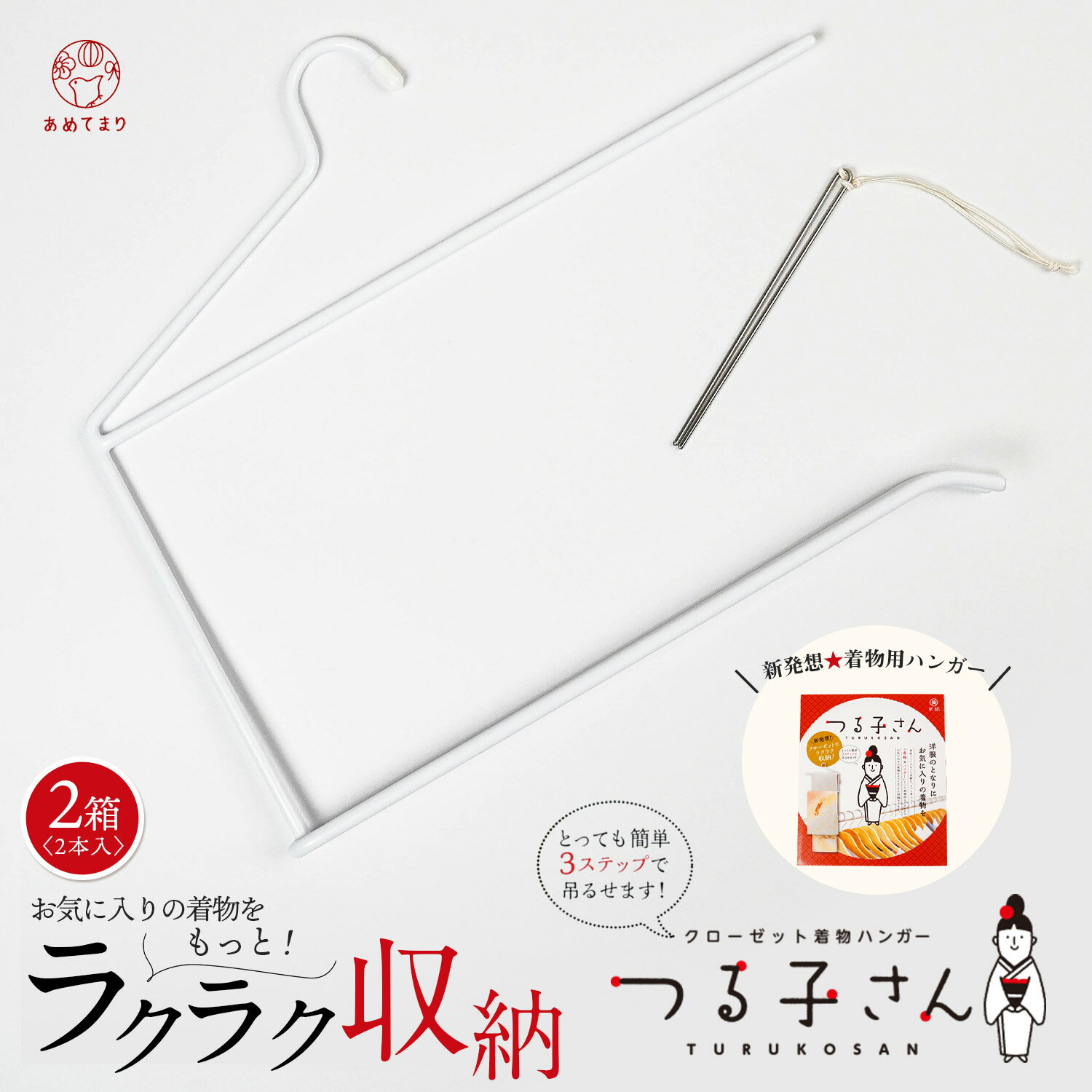 \おトクな2本セット/ 「着物 × ハンガー」という画期的なアイデアでお気に入りの着物をクローゼットにラクラク収納 クローゼット用着物ハンガー「つる子さん」 服のとなりにお気に入りの着物をクローゼットに掛けられる新発想の着物用ハンガー。 着物ライフをもっと気軽に、もっと楽しく! 「着物 × ハンガー」という画期的なアイデアでお気に入りの着物をクローゼットにラクラク収納できます。 現代の住宅事情では、たんすを置くスペースが確保できず、クローゼットに着物を掛けたり、重ねて置いたりという方が多いのではないでしょうか?? 従来の着物ハンガーだと場所をとったり高さが必要だったりしますよね。 和室もないし、洋室では鴨居も無いし和ダンスも置けない…………。 どうせハンガーに掛けたのならそのままクローゼットに収納してしまいたい…………。 そんな現代の着物生活にピッタリの、新型の「クローゼット用着物ハンガー」が登場しました! 着物を畳んである状態をそのままに、吊り下げて保管することができます。 タンスや衣装箱のように着物を重ねないので、着物の間にシワ防止の紙を挟み込む必要がありません。だから湿気を呼び込みにくい! 袖振りが開いている女性用着物、仮絵羽にもご利用いただけます。 シワ防止効果抜群です! クローゼットにかけると、どんなお着物を持っていて、今度は何が必要かわかりやすい! また、コーディネートもすぐに出来そうですね! 着物ライフが一層楽しくなります! \こんなお悩みを解決!/ ・大切な着物はきちんと保管したい ・洋風住宅住まいで和室もないしカモ居もない ・畳んで重ねると畳みシワがバッチリつく ・桐タンスなんて持ってない ・頻繁に着る着物は簡単に保管したい ・着物ハンガーでは横幅が広すぎてクローゼットにしまえない 【本数】2箱(1箱1本入×2) 【サイズ/品質表示】 ・横幅最大 / 400mm ・高さ / 360mm ・重さ / 400g ・材質 / 本 体:PEコーティングスチール、衿止め:ステンレス 【注意事項】 ※ご使用前に製品各部を点検してからご使用ください。また、異常や錆が認められる場合は使用しないでください。特に使用中において表面へのコーティングに傷が入ると錆の原因となりますので取り扱いにはご注意ください。 ※ハンガーに吊るしたままでのスチームアイロンのご使用はお控えください。 ※火気の近くや熱風の直接当たる所では使用しないでください。 ※長時間直射日光に当たる所や湿度の高い所での保管、洗濯物の乾燥に使用することなどはおやめください。 ※過度の荷重をかけないでください。 ※子供の手の届くところに保管しないでください。 ※配送時・保管時に箱がつぶれる可能性がございます。返品交換対象外となりますのでご了承ください。 6,580円 税込 送料別 カードOK レビュー4件 あめてまり ![]() | ||