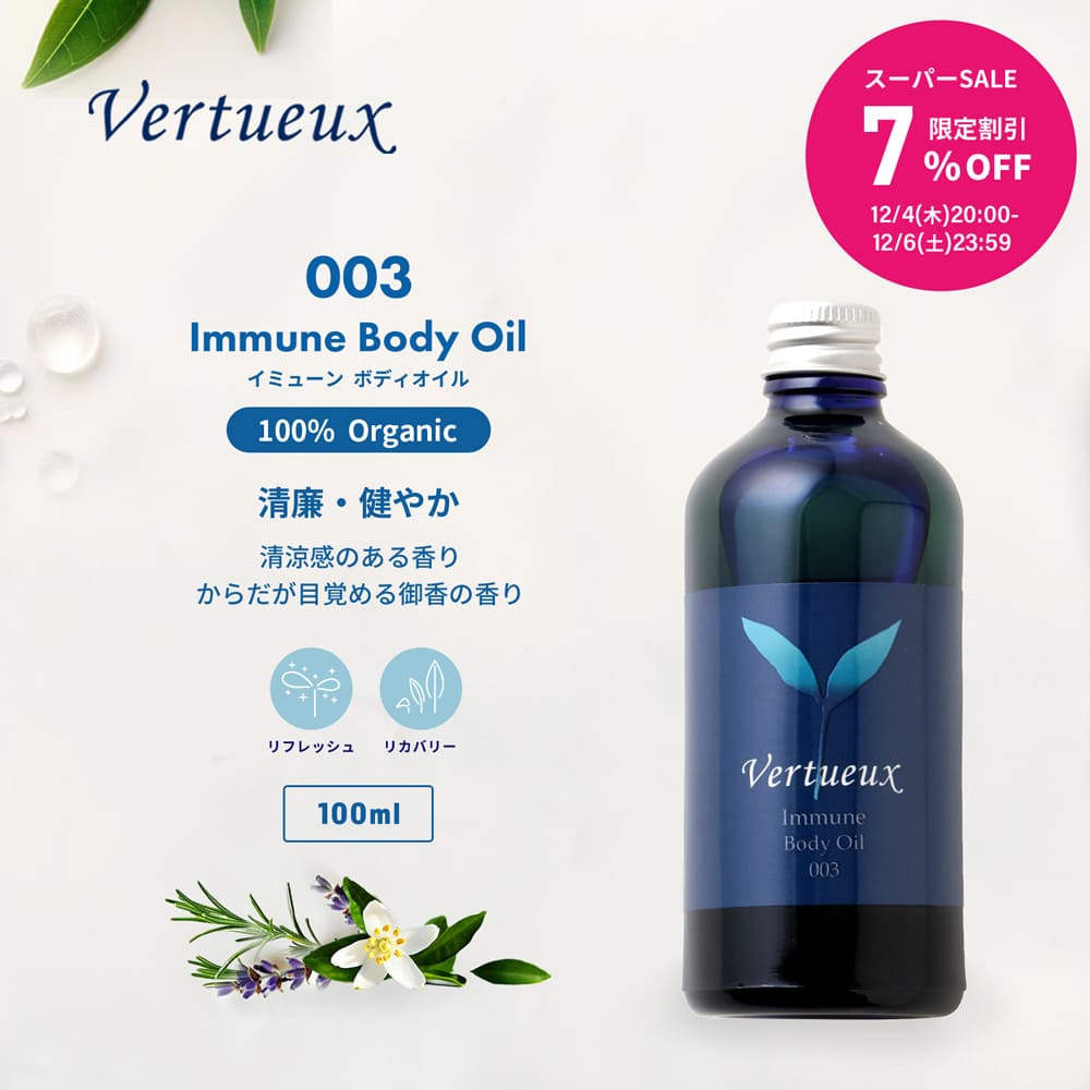 よく一緒に購入されている商品FL フィトオーセンティック フェイスローシ5,170円002 100ml ナーヴ ボディオイル アロ9,718円304 ビフィオ 60粒 善玉菌 乳酸菌 ビ4,082円 からだ創りをテーマにしたオイル 現代の日々の環境の中で、大気や食物からの汚染、感染などからからだを守れるつよいからだ創りをテーマとしたオイル。 ヴェルトゥーの【003 イミューン・ボディオイル】は” からだ創り ”が テーマ の ボディオイル 。 現代の 日々 の環境の中で、大気 や 食物 からの 汚染 、 感染 などからからだを 守れる つよいからだ創り を サポート します。 清涼感 のあるしゃきんと からだ全体 が 目覚める 香り。 皮膚 に 浸透する と 甘く上品な香り に 変化します。疲れた からだ にとても 心地よい 香り 。 肩凝り 、腰痛 など症状のある方へ。 お風呂上がり 、優しく オイル で マッサージ していただくと、硬くなったカラダが解れていくのを 実感 いただけると思います。 次のような方におすすめです。 肩凝り に お悩み の方 リラックス したい方 疲労回復 をしたい方 体調不良 に 悩んでいる 方 自律神経 の乱れを改善したい 方 ご愛用いただいている方から、たくさんの嬉しい評価をいただいております。続けてご使用いただくことで効果が出やすくなり、からだの変化を実感いただけると思います。 体の不調を改善し、明るく日々を過ごされたい方へ【003 イミューン・ボディオイル】をご検討くださいませ。ご注文お待ちしております。 アロマオイル ボディオイル フェイスオイル があります。オーガニック無添加 保湿 抗菌力 良い香り( いいかおりとタイプ ) 上質な 精油 マッサージ用 マッサージオイルとしても。ラベンダー ティトリー ユーカリ など代表的な精油も配合。 ヴェルトゥーのブレンド アロマオイル。乾燥肌 デリケートなお肌の方にも。 類似商品はこちらヴェルトゥー イミューン ボディオイル 00310,450円003 30ml イミューン ボディオイル ア4,180円003 30ml イミューン ボディオイル ア3,887円免疫 ボディオイル 2本 セット 30ml 07,012円001 100ml ヴァーンクル ボディオイル9,108円001 100ml ヴァーンクル ボディオイル10,120円002 30ml ナーヴ ボディオイル アロマ3,887円002 30ml ナーヴ ボディオイル アロマ4,180円003 イミューン 005 ナイトタイム ヴェ7,672円新着商品はこちら2025/11/22S002 シルク ソープ 85g 未精製 エ4,770円2025/11/22S003 モンモリロナイト ソープ 85g 4,770円2025/11/22S104 ユッカ ソープ 85g 固形石鹸 5,500円再販商品はこちら2025/12/4003 30ml イミューン ボディオイル ア3,887円2025/12/4012 30ml アフロディジアック ボディオ3,887円2025/12/4007 30ml リプロダクティブ ボディオイ3,887円2025/12/04 更新 003 イミューン・ボディオイル VERTUEUX IMMUNE BODY OIL からだ創りをテーマにしたオイル 現代の日々の環境の中で、大気や食物からの汚染、感染などからからだを守れるつよいからだ創りをテーマとしたオイル。 香り 清涼感のあるしゃきんとからだ全体が目覚めるような御香の香り。 皮膚に浸透すると甘く上品な香りに変化します。疲れたからだにとても心地よい香り。 ブレンド 地球環境の中で、汚染や感染から守っていけるようなからだ創りをテーマにブレンド。 容量 100ml 使用期限 ボトルのラベルに記載 全成分 ピーチカーネル ホホバ マイトル(モロッコ) ラベンダー(ブルガリア) ユーカリプテイスグロービス(ポルトガル) ニアウリ(マダガスカル島) ペパーミント(イギリス) ヴェテイバー(インドネシアジャワ島) 効能に関する説明におきまして、お客様のお身体の体質、体調または当該製品のご使用方法及び頻度によって個人差、相違がございますので予めご了承いただきますようお願い申し上げます。 当該製品は、成分を生きたものとして取り扱い、試験検査を厳しく行ない、製造国より空輸しておりますが、温度変化、光、熱に敏感な製品でありますので、お客様のお手元に届いた際、高温多湿期の夏場は低温の暗い場所に置かれますことをお奨めいたします。 *100%自然有機原材料のため、開封後6ヶ月以内にご使用ください。 *天然成分のため、香りが変化する場合がございます。 *日の当たるところや高温のところに置かないでください。 *万が一お肌に合わない場合には直ちにご使用をおやめください。 9,718円 税込 送料込 カードOK レビュー9件 ヴェルトゥー 公式ショップ ![]() | ||