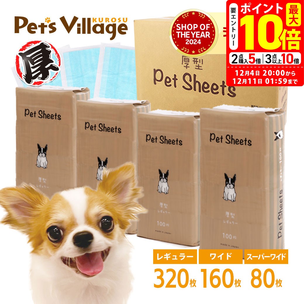 楽天ランキング常連!リピーター続出♪当店人気No.1ペットシーツです☆ \厚型ペットシーツ/ ■サイズ: レギュラー:33.5×45cm/ 1袋80枚入×4袋 ワイド:45×60cm/ 1袋40枚入×4袋 スーパーワイド:60×90cm/ 1袋20枚入×4袋 ■国産(日本製) 1袋 / 1ケース(4袋) ----------------------------------------------------------------- \中厚型/ ちょうどいいが、いちばんいい。 ふんわり優しい色合いのパッケージと。暮らしにフィットする中厚型。 「ちょうどいい」って、こんなにやさしい。 🆕「中厚型ペットシーツ」新発売! 2025年夏、新たに登場。 ペットとの毎日をもっと快適に、もっとちょうどよく。 厚型よりも薄く、薄型よりも厚い。 こんなに、ちょうどいいのあった!新発想の中厚型ペットシーツ! ■特長 ◎薄型よりもしっかり吸収 安定の吸収ポリマーで、しっかり吸収。中厚型ならおでかけも安心。 ◎厚型よりもコンパクトに収納 スリムなサイズ感で、すっきり収納。 ◎長時間使えて、留守番にも安心 吸収力にこだわった、信頼の中厚タイプ。 ■お部屋の雰囲気にもなじむデザイン やさしいナチュラルカラーのパッケージで、インテリアにもなじみます。 シンプルでわかりやすい表記だから、使う方にストレスを与えません。 さりげない存在感がちょうどいい。 落ち着きのある、ほっとするかわいいパッケージ。 ■表面の速乾シートで足濡れしにくい → 吸収だけでなく「足元の快適さ」も意識した設計。 ■消臭加工でニオイ対策も◎ → 留守中も安心できる、ニオイの悩みを軽減。 ■サイズ: レギュラー:34×45cm/1袋100枚×4袋 ワイド:43×60cm/1袋50枚×4袋 スーパーワイド:90×60cm/1袋20枚×4袋 ■製品素材: 表面材:ポリオレフィン不織布 吸収材:綿状パルプ、吸収紙、高分子吸収材 防水材:ポリエチレンフィルム 結合材:ホットメルト粘着材 ■国産(日本製) ※こちらの商品は「同梱不可」指定商品となっております。他の商品を一緒にご注文の場合、その他商品に対して別途送料が発生致しますので予めご了承ください。※なおシステム上、他の商品を一緒にご注文の場合、送料無料で自動配信メールが届きますが、後日注文処理後に送料料金が訂正されたメールが当店から届きますので、ご確認下さい。 ⇒詳細はコチラ よく検索されるキーワード | 業務用 まとめ買い 犬用シーツ トイレシーツ 高吸収シーツ 超吸収 臭わない 国産 漏れ防止 速乾性 超小型犬 小型犬 中型犬 大型犬対応 多頭飼い対応 室内トイレ用 トイレトレーニング 日本製 コスパPoint 1: ポリマー量5%アップ! ポリマーの量を増やした結果、吸収部分の肌触りがふんわり柔らかくなりました。 Point 2: スポット吸収 一般的に、小型犬の1回のオシッコ量が30mlと言われています。従来品よりも、より小さい範囲でオシッコを吸収し、広がりを抑えてくれます。 Point 3: 吸収量アップ! さらに、ポリマーを増量したことで! 従来の厚型ペットシーツより、吸収量が最大1.3倍アップしました! Point 4: ウエットバック量の軽減! 今までの商品よりも速乾性がアップしたので、より足濡れを軽減することが出来ました。 商品は持ち運びやすい持ち手つき。 さらに圧縮コンパクト包装で、場所をとりません。 吸収面は、エンボス加工されています。スーパーワイドサイズは従来の加工と一緒です。 ペットシーツ専門メーカーでつくった、ペッツビレッジのプライベートブランドです。 さらに、品質の向上では「爪でのひっかき」について悩むお客様の声も参考に、「シートの圧着を強くし、爪などのひっかきにより強く!」するなどにも配慮しました。 また、この商品の売り上げの一部は公益財団法人日本盲導犬協会に寄付されます。 3,980円 税込 送料込 カードOK レビュー5613件 ペッツビレッジクロス ![]() | ||