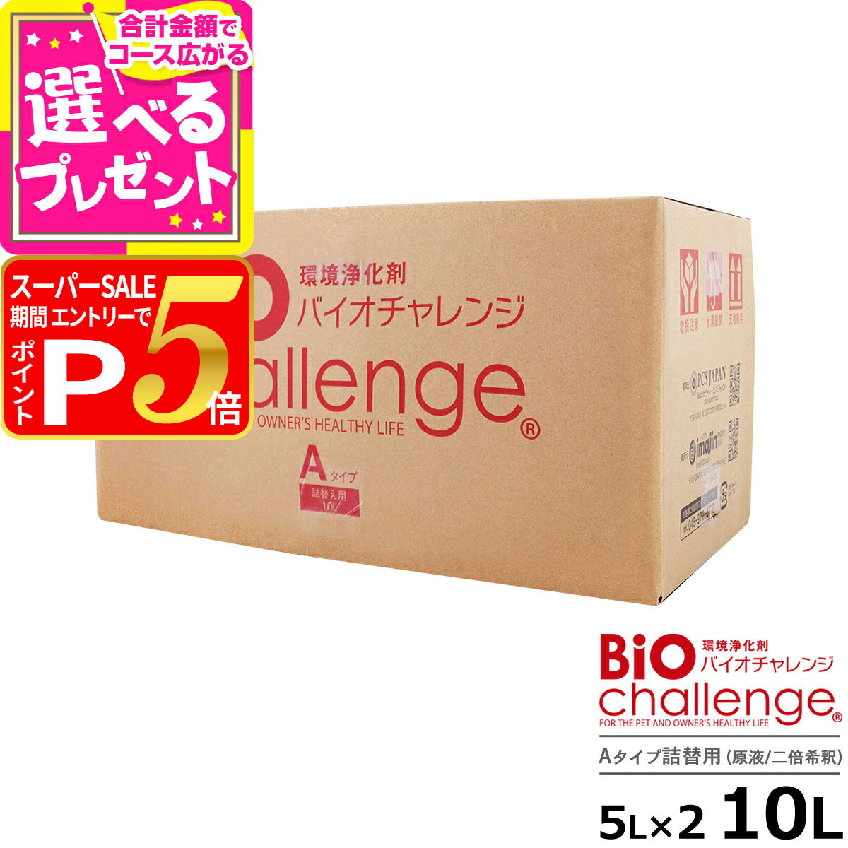 欠品の際にはあらためてご連絡いたします。バイオチャレンジの解説バイオチャレンジは安全で、人にもペットにもやさしい消臭・除菌・防ウイルス剤。安定化二酸化塩素水溶液が主成分で刺激もなく、ペットがなめても安心の消臭剤です。持続性にすぐれたAタイプは主に家庭や犬猫美容室で使用されています。BタイプはAタイプに比べて酸化反応が早く、殺菌殺ウイルス・消臭効果を1〜5分以内に得ることができるため、主に 動物病院や繁殖場・研究施設で活躍しています。直射日光の当たらない風通しのよい場所に保管してください。 バイオチャレンジの詳細 ブランド名 バイオチャレンジ 商品名 バイオチャレンジ 10L(5L×2本)原液詰替用(持続性Aタイプ) 内容量 10L(5L×2本) パッケージ 袋:PE,M,PA,PET キャップ:PP 主成分 安定化二酸化塩素水溶液 仕様 1000ppm、pH9.2(製造時) ブランドの特徴 バイオチャレンジは、アメリカ環境保護庁、アメリカ食品薬品局、世界保健機構(WHO)において安全性、殺菌消毒性能、脱臭性能、防腐等の効果が認められている安全性の高い安定化二酸化塩素を主成分とする除菌・消臭剤。人にもペットにもやさしく、をモットーに北里大学教授の協力のもと、開発されました。バイオチャレンジは除菌・浄化・消臭効果にすぐれており、家庭や動物病院、飼育施設などで幅広く使用されています。ペットがなめても安全、室内に噴霧しても有害物質を発生しません。またスプレーしたバイオチャレンジは、微小の粒子となって空気中に残留し、長時間にわたり効果を発揮し続けます。毎日安心してお使いいただける除菌・浄化・消臭剤です。ペット用としてだけでなく、ご家庭の中全般に安心してお使いいただけます。 使用方法 バイオチャレンジ原液を1、水1の割合で希釈し、専用スプレー容器に入れてご使用ください。希釈には不純物のない水道水をご使用ください。使用用途により、原液で使用していただくことも可能です。加湿器に入れる場合は、原液を30〜40倍に薄めてご使用ください。加湿器をうまく利用することで、気化したバイオチャレンジ粒子が日頃お手入れできないところまで入り込んで残存するので、空間除菌や飛沫感染予防に効果的です。気化したバイオチャレンジの水蒸気を吸い込んでも問題ありません。AタイプとBタイプの使い分けにつきまして。BタイプはAタイプよりも粒子が細かく酸化反応が早く即効性にすぐれていますので、動物病院やブリーダー、ホテルなどで活躍しています。一般的なご家庭では、Aタイプをお使いになることが多いです。 保管場所 日光の当たらない、温度差のない室内にて常温保管 品質保証期間 製造より1年。通常は保証期間まで10〜12か月の商品をお届けいたします。具体的な期限をお知りになりたい場合はお問い合わせください。正しく保管していただければ、保証期間まで十分にご使用いただけます。水で希釈したバイオチャレンジは、できるかぎり早く使い切ってください。 使用用途 ○お部屋の除菌・消臭に ○生ごみの除菌・消臭に ○便座やドアノブなどの除菌に ○ペットのトイレやケージ周りの除菌・消臭に ○ペットのお散歩やおでかけに ○トリミング器具の洗浄に ○その他 衛生管理に 第三者機関による効果・安全性試験実施済 ○インフルエンザウイルス不活化試験○ネコカリシウイルス(ノロウイルスの代替)不活化試験PR200904-1 株式会社ビオスタ調べ○急性経口毒性試験試験番号 207232N-1 食環境衛生研究所調べ○急性皮膚刺激性・腐食性試験試験番号 207232N-2 食環境衛生研究所調べ 使用上のご注意 ○バイオチャレンジは消臭と浄化を目的とした環境浄化剤です。処方薬ではありません。○水溶性ですので、皮膚に付着してもきれいな水で洗えば簡単に落とせます。○目や口に入った時は、きれいな水で洗い、うがいをしてください。○若干の漂白作用がありますので、体毛(ペットに直接使用の場合)や使用対象物にご注意ください。○専用スプレー以外を使用する場合は、よく洗浄してからご使用ください。○希釈した液は残さず早めに使い切るようにしてください。○加湿器に使用する場合は、必ず加湿器本体の説明書をご確認ください。○液体が薄黄色く変色することがありますが、本来の性能にはまったく影響ありません。○必ず室内で保管してください。○無臭ですが、気温や湿度により臭いを感じることもあります。品質上、問題ありません。 製造国 日本 製造元 株式会社ピーシーエスジャパン その他 当店は正規販売店です。安心してお買い求めください。バイオチャレンジ 人にも、ペットにもやさしい環境浄化剤 バイオチャレンジの使い方 7,700円 税込 送料別 カードOK レビュー1006件 ドッグパラダイスぷらすニャン ![]() | ||