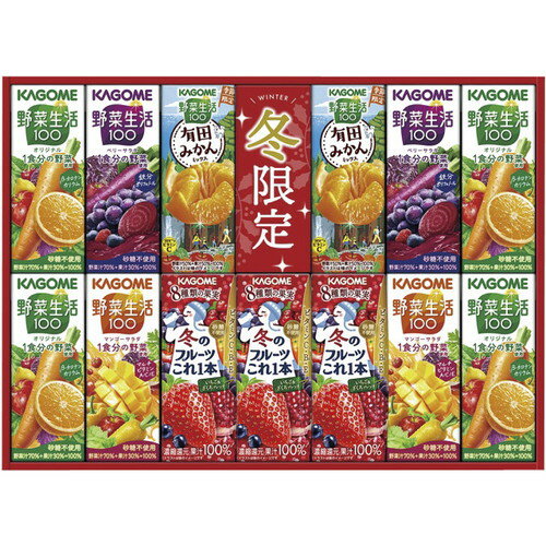 メーカー直送のため、代金引換決済および後払い決済はキャンセルとなります。お申し込み後の変更・キャンセルはお受けできません。また、お届け先様の転居・住所不明・長期不在などが発生した際は商品をご依頼主様へ転送させていただきます。こちらの商品はメーカー出荷のため1注文につき1個の発送となります。(同梱不可)複数お求めの場合はお手数ですが、1配送ごとのご注文をお願い申し上げます。■こちらの商品はお歳暮用ギフト商品になります。■お届けは11月中旬からとなります。■お届け日の指定はできません。■ご注文より1-2週間ぐらいのお届けになります。■紙袋のご用意はございません。※北海道、沖縄、離島へのお届けはできません。※簡易梱包、簡易のしになりますカゴメの人気の野菜飲料&フルーツジュースを詰め合わせたバラエティセットです。■野菜生活100(オリジナル200ml×4・ベリーサラダ200ml×2・マンゴーサラダ200ml×2・有田みかんミックス195ml×2)、冬のフルーツこれ一本200ml×3■箱255×376×48mm 2,580円 税込 送料込 カードOK 激安ショップE・T・M ![]() | ||