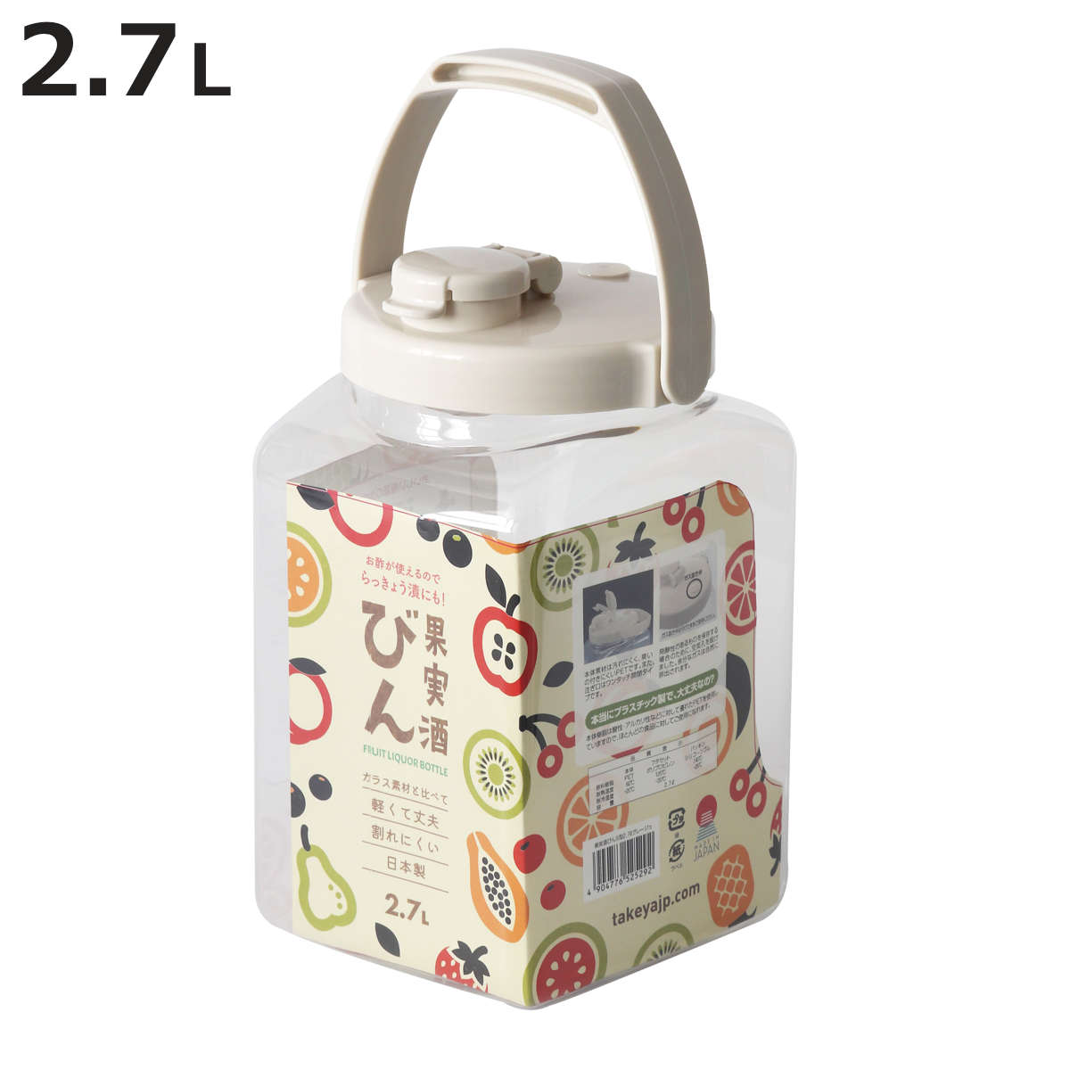 サイズ約 幅15.4×奥行12.9×高さ22.5(cm)重量約 216g容量約 2.7L内容量1個材質本体:PETフタセット:ポリプロピレンガス抜き弁・パッキン:シリコーンゴム生産国日本製パーツ別耐熱温度本体:60度フタセット:120度ガス抜き弁・パッキン:140度耐冷温度-20度注意事項※商品ページ内には別の商品を含む画像を使用しています区分返品・キャンセル区分(小型商品)ギフトラッピングページを見る●ガラスのように見えてとても軽く、割れにくい素材の果実酒びんです。●角型タイプの2.7Lです。●並べて置きやすく、ストック管理もしやすい形状です。●フタが降りてこない構造で、移し替えがスムーズにおこなえます。●日本製の安心品質です。おすすめポイント軽量で割れにくい 果実酒びん角型2.7Lガラスのような透明感がありながらとても軽く、落としても割れにくいPET素材を使用した果実酒びん2.7Lです。扱いやすく、果実酒づくりが初めての方でも安心して使えます。省スペースで整理しやすい角型タイプ角型タイプなのでデッドスペースを作らずすっきり収納でき、限られたスペースでも効率よく保管できます。持ち手付きで扱いやすい持ち手が付いているので中身が重くなっても持ち運びやすく、注ぐときも安定して扱えるため、仕込みから保存・移し替えまで快適に使えます。商品詳細発酵にも安心のガス抜き弁付き梅シロップや酵素シロップなど発酵でガスが出る仕込みにも対応できるガス抜き弁を搭載。必要に応じて開閉できるため、ガスを逃がしつつ風味はしっかりキープできます。ワンタッチで注げるロック付き注ぎ口ロック機能付きの注ぎ口蓋で、グラスや別容器にそのまま注げてこぼれにくく、できあがった果実酒やシロップをスムーズに移せるため余計な手間がかかりません。酸に強く、においや汚れがつきにくい本体には酸やアルカリに強いPET素材を使用しており、酢漬け・果実酒・シロップなど酸を使うレシピにも安心して使えます。においや汚れがつきにくく、清潔な状態を保ちやすいのも特徴です。単品・セットの購入はこちら1個【▲このページの商品】3個セットシリーズ紹介角型 1.4Lスリム角型 2.1Lスリム角型 4.0L丸型 2.4L丸型 4.2L■2026-03-10メーカーのカラー変更のため、ページをリニューアルしました。関連キーワード:梅酒用保存容器 果実酒用保存容器 自家製梅酒 自家製果実酒 自家製 自家製梅シロップ 梅シロップ作り プラスチック製保存容器 果実酒容器 食品保存容器 漬物 漬け物 酵素シロップ 梅シロップ おすすめ オススメ 役立つ 便利 軽い 安全 安心 機密性抜群 キッチン用品 キッチン小物 キッチン雑貨 台所用品 LH14409関連商品はこちら梅酒容器 保存容器 果実酒びん S型 4.0L1,080円梅酒容器 保存容器 果実酒びん S型 2.7L2,500円梅酒容器 保存容器 果実酒びん R型 4.2L1,080円梅酒容器 保存容器 果実酒びん R型 2.4L878円保存容器 果実酒びん S型 1.4L スリム 718円梅酒容器 保存容器 果実酒びん S型 2.1L818円梅酒容器 保存容器 果実酒びん S型 1.4L658円梅酒容器 保存容器 果実酒びん S型 4.0L3,100円梅酒容器 保存容器 果実酒びん S型 2.1L2,290円梅酒容器 保存容器 果実酒びん R型 2.4L2,500円梅酒容器 保存容器 果実酒びん R型 4.2L3,100円梅酒容器 保存容器 果実酒びん S型 1.4L1,870円 878円 税込 送料別 カードOK レビュー3件 お弁当グッズのカラフルボックス ![]() | ||