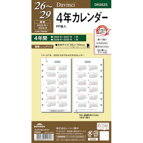 【商品説明】●規格サイズ:バイブル。●ページ数:1。●始まり曜日:日曜日。●始まり月:1月。●主レイアウト:4年分 2026〜2027年、1枚 2028〜2029年、1枚。●レイアウト1:イヤー。●レイアウト2:年間。●レイアウト3:ブロック。●六曜の有無:無。●掲載期間(月間ページ):2026年〜2027年。●掲載期間(週間ページ):2026年〜2027年。類似商品はこちら翌日出荷 レイメイ藤井 DR2629 26ダ・3,023円翌日出荷 レイメイ藤井 DR2613 26ダ・... 309円 税込 送料別 カードOK 測定器・工具のイーデンキ ![]() | ||