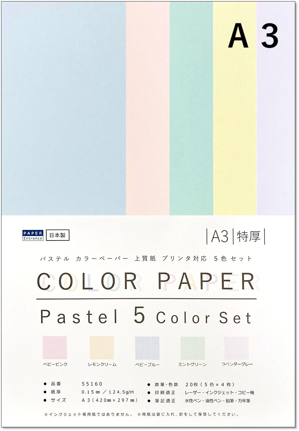 商品情報 原紙 日本製 色上質紙 5色(さくら、レモン、浅黄、あじさい、ラベンダー) 寸法 A3(420mm×297mm) 紙厚 0.15mm・坪量124.5g/m2 数量 20枚入(4枚×5色) 筆記・印刷適正 水性ペン、油性ペン、鉛筆、朱肉、レーザー、インクジェット (顔料・染料)、インクリボン 注意 モニターの発色によって、多少お色みが異なる場合がございます。 価格・カート商品の特徴・用途 淡いパステルカラーの上質紙5色セット。撮影用背景紙・工作・フライヤー・POP・台紙・席札など、幅広い用途でお使いいただけます。 特徴 安心・安定の品質 原紙は国内製紙メーカー品。当社では、原紙の調達~加工製作~販売まで一貫して行っているため、安定の品質にてご提供いたします。用紙の反りや断裁のバラつきもないよう適切な加工管理をしております。 明るく淡い5色 あらゆるシーン・用途にもお使いいただけるように、色種・色調のバランスを考慮した、やわらかなパステルカラー5色を1パックにおまとめしました。紙の色で表現の幅が自在に広がります。 しっかりした厚み 紙厚は0.15mm、ハリのある画用紙程度の硬さです。適度なしなやかさもあるため、カット・パンチ穴・折りなどの加工もしやすい仕様となっております。 筆記・印刷適性 平滑性のある上質紙のため、ひっかかりもなく、さらさらとスムーズな書き心地です。プリントも滲みなくきれいに仕上がります。 用途 撮影用 被写体が引き立つように、色種・色調のバランスを考慮した淡い5色を1パックにおまとめしました。フリマアプリの撮影用背景紙に最適です。同封のあて紙はレフ板としてお使いいただけます。 手書き用 優れた平滑性であらゆる筆記用具とも相性が良いので、手書きのメニュー・メッセージカード・ノートの表紙・プライスカードなど幅広い用途でお使いいただけます。 プリント用 レーザー、インクジェットなど各種プリンタでの印刷適性があります。厚みのあるフライヤー・チラシ・POP・チケットなどに最適です。5色入っておりますので、内容や季節に応じて色を変えたりできます。 工作用 画用紙のようにカットしたり、折ったりと加工しやすい厚さなので、パッチワークのペーパーライナー・ペーパークラフトなど工作用としてお使いいただけます。 紙製品の専門店・PAPER Entrance 全国大小の様々な洋紙・和紙メーカーから、選りすぐりの紙を調達し、加工するノウハウを有しています。気持ちよくお使いいただけるよう、「紙」に精通したスタッフたちが、以下の3つをモットーに真心を込めて製造・販売いたします。 ○丁寧 紙は折れやすかったり湿気に弱かったり、繊細な商品です。紙の特性を知り尽くしたスタッフが、丁寧に大切に、製作・梱包・出荷をいたします。 ○安心 紙の専門家により、多種ある紙銘柄の中から厳選された紙を商品化しております。安心・安定の品質をご提供いたします。 ○明快 紙は、手触りや厚み・ハリなど、実際に触らないとわかりづらい商材です。安心して購買いただけるよう、最大限に明快でわかりやすいご案内を心がけます。 1,480円 税込 送料込 カードOK レビュー2件 ペーパーエントランス ![]() | ||