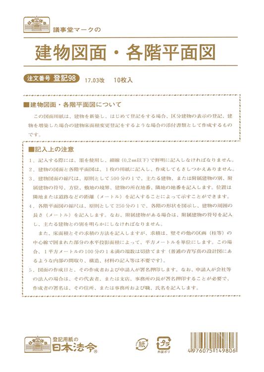 この図面用紙は、建物を新築し、はじめて登記をする場合、区分建物の表示の登記、建物を増築した場合の建物床面積変更登記をするような場合の添付書類として作成するものです。 ※B4判・10枚 550円 税込 送料別 カードOK レビュー1件 日本法令 楽天市場店 ![]() | ||