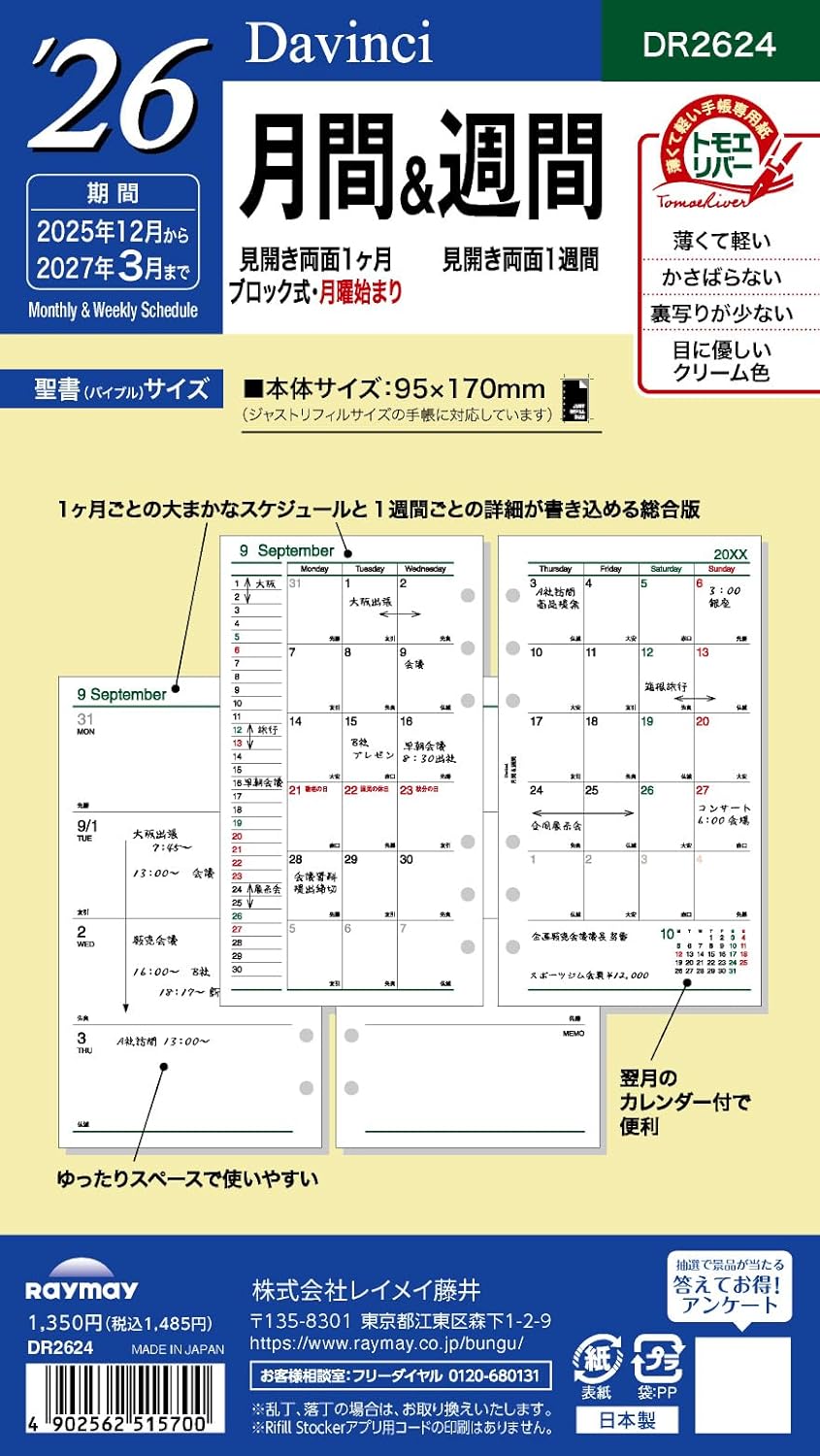 ●仕様:見開き両面1ヶ月ブロック式&見開き両面1週間 ●入数:16ヶ月分、2025年12月〜2027年3月 212ページ(106枚) ●サイズ:W95 × H170mm ●手帳専用紙 ●スケジュールを使い分けられるタイプです 1,485円 税込 送料別 カードOK 文具ステーションフジワラ ![]() | ||