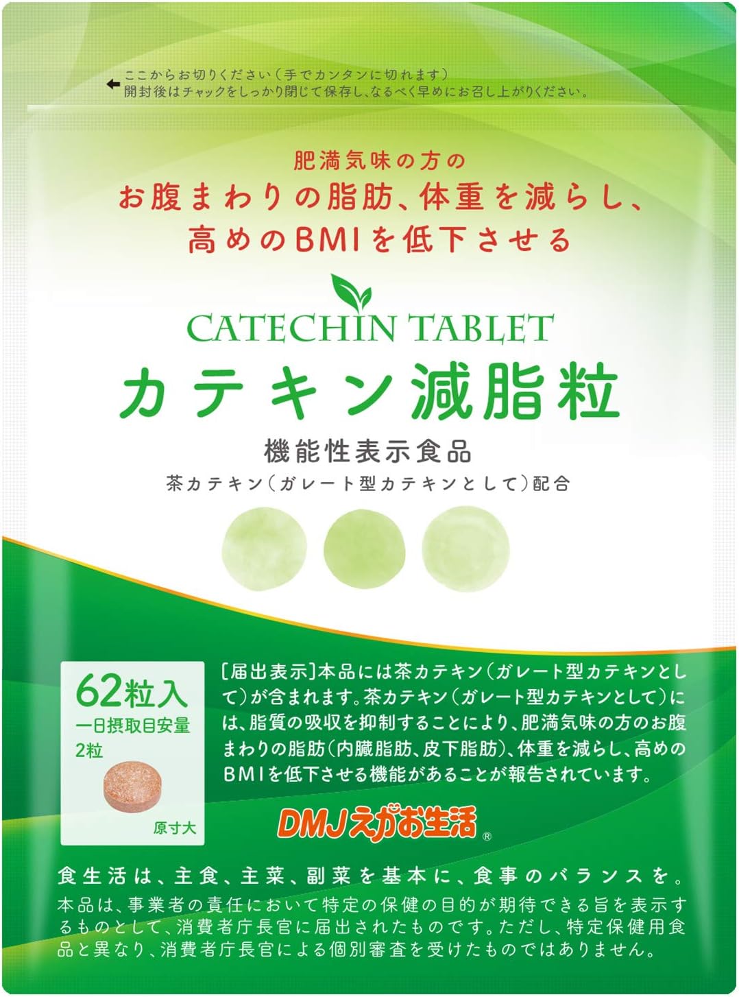こんな方にオススメ?肥満気味の方(対象者:BMI23〜30未満)?茶カテキンサプリで機能性表示食品をお探しの方?カテキンサプリをお求めの方 商品特徴?1日たった2粒目安でOK?手軽に飲みやすいタブレットタイプ?実感していただくためは最低でも半年以上、1年・2年お続けいただくことが大切です 徹底した品質管理?消費者庁届出済みの機能性表示食品?GMP認定の国内工場で製造?保存料・香料・着色料無添加?残留農薬検査・食品細菌検査・重金属検査・急性毒性検査など徹底した品質管理実施?安全性評価済み(安全性試験・既存情報・医薬品との相互作用・食経験を届出者の評価済み) 届出表示?本品には茶カテキン(ガレート型カテキンとして)が含まれます。茶カテキン(ガレート型カテキンとして)には、脂質の吸収を抑制することにより、肥満気味の方のお腹まわりの脂肪(内臓脂肪、皮下脂肪)、体重を減らし、高めのBMIを低下させる機能があることが報告されています。商品仕様?届出番号:F61?機能性関与成分名および含有量:茶カテキン(ガレート型カテキンとして)150mg?内容量:18.6g(1粒300mg×62粒)?摂取目安量:1日あたり2粒を目安にお召し上がりください。お食事の際に、噛まずに、水またはぬるま湯でお召し上がりください。開封後はお早めにお召し上がりください。?栄養成分表示 2粒(0.6g)あたり:エネルギー2.31kcal たんぱく質0.004g 脂質0.01g 炭水化物0.55g 食塩相当量0-0.001g 3,670円 税込 送料込 カードOK Happiness Life 楽天市場店 ![]() | ||