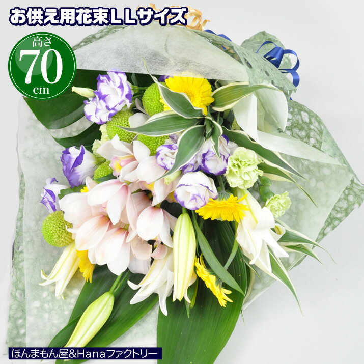 商品名 ユリ・蘭入りお供え花束LLサイズ この商品の特徴 季節の旬のお花をたっぷり使ってお供え用に安心して使っていただけるボリューム満点の花束をお作りいたしました。 高さは約65〜70cmもあり、重量感も満点。 どうしてもお供え用のお花はその大きさも重要な事が多いですが、その心配は全くの無用です。 花材をおまかせ頂くことで、その季節の一番綺麗でイキの良いお花を使い作成させて頂きます。 また、ラッピングのお色も選択していただけるので、おおまかな雰囲気もお選び頂けます。 ユリと蘭が必ず入るので、厳格で豪華な雰囲気の花束となっております。 2つご購入いただくことで、左右対称の一対としてお届けする事も可能でございます。 サイズ 高さ70cm、幅30cm ※お花ですので個体差があります 花材 ユリ・シンビジウム(必ず入ります)、季節のお花・季節のグリーン 添付品 希望によりメッセージカード、切り花延命剤、お手入れのしおり ※立札はおつけできません 簡易ラッピングでのお届けになります 大きさが重要な場合に最適です お寺や斎場などでの法要に使える、さらに豪華でボリュームのあるお供え用花束はありませんか? そんなお声を頂きこの花束を作りました。 かねてよりリピート率が非常に高い、「お供え花束Lサイズ」をさらに豪華に、さらに大きく。 ユリだけではなく、洋ランもあしらった迫力のある仕上がりとなっています。上品な和紙ラッピングも、こだわりのひとつです。 本商品のこだわり お寺や斎場などでの法要に使える、さらに豪華でボリュームのあるお供え用花束はありませんか? そんなお声を頂きこの花束を作りました。 かねてよりリピート率が非常に高い、「お供え花束Lサイズ」をさらに豪華に、さらに大きく。 ユリだけではなく、洋ランもあしらった迫力のある仕上がりとなっています。上品な和紙ラッピングも、こだわりのひとつです。 ◆旬のお花を使いその日一番美しい花束に お花は四季によって美しいものが変わります。 ですので、その時々で一番イキイキと美しいお花をふんだんに使い花束を作成いたします。 花材は全て「おまかせ」になりますが、どうぞご安心下さい。 この花束には、「ユリ」と「洋ラン」は必ず入ります。 ユリの高貴な姿と気高い香り、洋ランの美しく優しい様は、 花束をより美しく見せてくれるんです。 ◆ラッピングにもこだわりを! シャリ感のある、和紙ラッピングは花束をさらにボリュームよく、またとても上品に見せてくれます。 花の色・またラッピングの色にあったリボンを結んで、お供えギフトにも完璧に満足頂ける花束になりました。 ◆御自宅用にお使いになるときは、こんなオプション 自宅で使用される場合は、ラッピングが不要な時ってありませんか? ゴミが増えちゃうし・・・すぐ外すし・・・。そんな時はこんなオプション。 「ラッピングを希望しない」をご選択頂くと、少しお花を増量し簡易ラッピングでお届け。 キリスト教などには菊抜きも可能 宗派による特定のお花を抜いて作成する事も可能です。 その場合はご注文時、備考欄に「キリスト教なので菊抜きで」などと一文お書き添え頂ければ幸いです。 送料・お届け不可地域について こちらの商品は送料無料商品です。 北海道.沖縄.青森.秋田.岩手.離島など当店から2日かかるエリアにはお届け出来ません。ご注文をくださった場合まことに申し訳ございませんがキャンセルさせていただきます。 クール便発送不可商品です こちらの商品はクール便での発送が出来ませんため、特に夏場のお届けに関しましてはご注意下さい。 この商品は以下の用途におすすめです 御供 粗供養 御仏前 御霊前 回忌法要 お通夜 お葬式 枕花 命日 お墓参り ご仏壇に 10,000円 税込 送料込 カードOK レビュー14件 Hanaファクトリー ![]() | ||