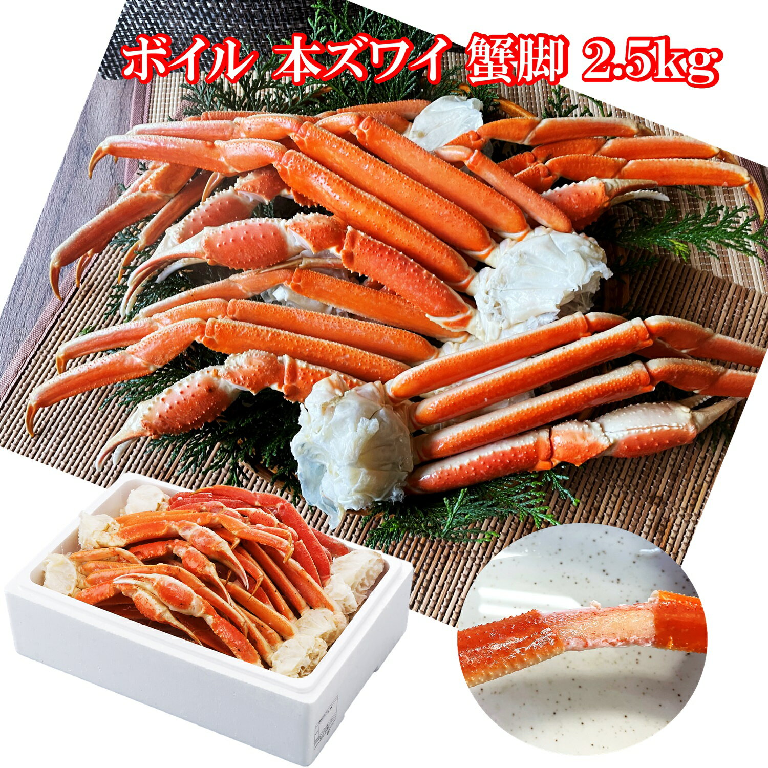 【お歳暮 誕生日 ギフト 贈答 ご自宅用】 ・塩味がついていますので冷蔵庫で自然解凍し、8分目程度の半解凍でお召し上がりください。 ※完全に解凍すると、溶けた水分とともにカニの旨味も抜けてしまいます。 ※【流水解凍、冷凍のままレンジで加熱・ゆでる・蒸す】はカニの旨味が逃げてしまうのでお控えください。 ※蟹ばさみで関節を切り、身を取り出すか、関節を手で折って身を取り出してください。 商品説明 名称 ゆでがに 原材料名 ズワイガニ脚、食塩 内容量 2.5kg 産地名 ロシア産 賞味期限 出荷日より約120日 保存方法 -18℃以下で保存して下さい。 販売者 仙台漬魚株式会社 宮城県塩釜市新浜町3丁目29-7 備考 冷凍便でのお届けとなります。栄養豊かな海域で漁獲、船上で塩水ボイルした鮮度抜群のボイル本ズワイ蟹です。 9,800円 税込 送料別 カードOK レビュー1件 仙台漬魚本舗 ![]() | ||