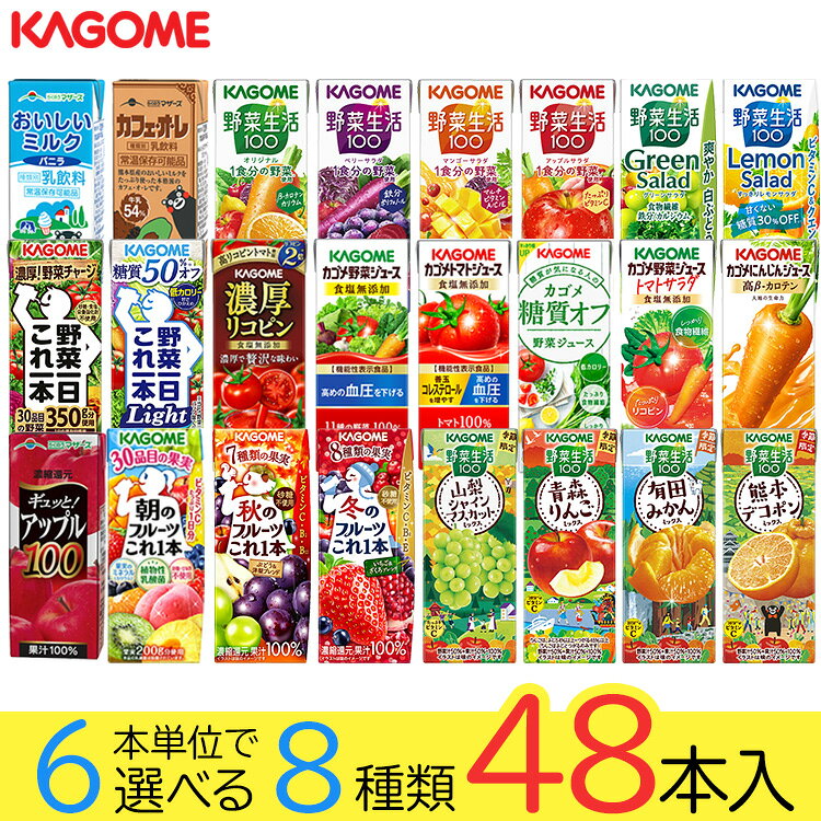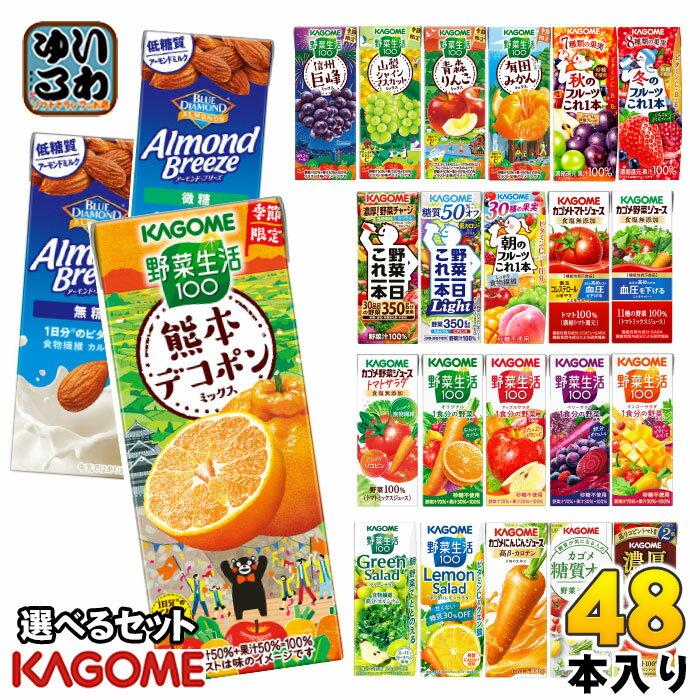 【バリエーションは下記をクリック】・選べる 24本・選べる 48本 (24本×2)・選べる 72本 (24本×3)・選べる 96本 (24本×4)【一個あたり 107円(税込)】カゴメ 紙パックシリーズを2ケース (1ケース24本入を2セット合計48本) お選びいただけます。※アソートセットではありません。※「アーモンド・ブリーズ 無糖」、「アーモンド・ブリーズ微糖」 は期間限定で1ケースのみお選びいただけます。▼選べる種類▼・アーモンド・ブリーズ 無糖 200ml・アーモンド・ブリーズ 微糖 200ml・野菜生活100 信州巨峰ミックス 195ml・野菜生活100 山梨シャインマスカットミックス 195ml・野菜生活100 青森りんごミックス 195ml・野菜生活100 有田みかんミックス 195ml・野菜生活100 熊本デコポンミックス 195ml・秋のフルーツこれ一本 ぶどう&洋梨ブレンド 200ml・冬のフルーツこれ一本 いちご&ざくろブレンド 200ml・野菜一日これ一本 200ml・野菜一日これ一本 Light 200ml・朝のフルーツこれ一本 200ml・トマトジュース 食塩無添加 200ml・野菜ジュース 食塩無添加 200ml・野菜ジュース トマトサラダ 食塩無添加 200ml・野菜生活100 オリジナル 200ml・野菜生活100 アップルサラダ 200ml・野菜生活100 ベリーサラダ 200ml・野菜生活100 マンゴーサラダ 200ml・野菜生活100 グリーンサラダ 200ml・野菜生活100 すっきりレモンサラダ 200ml・にんじんジュース 高β-カロテン 200ml・糖質オフ 野菜ジュース 200ml・濃厚リコピン 195ml◆アーモンド・ブリーズ (無糖/微糖)カリフォルニア契約農園アーモンド使用のアーモンドミルク(※牛乳ではありません)。アーモンドの香ばしい香りとコクがありつつ、後切れの良い味わいをお楽しみ頂けます。◆野菜生活100 信州巨峰ミックス長野県産巨峰の力強い味わいに、りんごやクランベリーを加え、果実ピューレを絶妙に配合しました。◆野菜生活100 山梨シャインマスカットミックス15種の野菜と3種の果実を使用し、山梨県産シャインマスカットのジューシーな味わいに仕上げた野菜&果実100%ジュースです。たっぷりビタミンC。砂糖不使用。◆野菜生活100 青森りんごミックス青森県産りんごの甘くて美味しい味わいの野菜・果実100%ミックスジュースです。◆野菜生活100 有田みかんミックス芳醇な甘さとまろやかなコクのある和歌山県有田みかんの味わいの野菜&果実100%ミックスジュース。◆野菜生活100 熊本デコポンミックス上品な甘さが特徴の熊本県産デコポンの味わいの野菜・果実100%ミックスジュースです。◆秋のフルーツこれ一本 ぶどう&洋梨ブレンドぶどうや洋梨等の7種類の果実をおいしくブレンド。たっぷりビタミンC・B2・B12やポリフェノールが摂れる秋限定の100%果実ミックスジュースです。◆冬のフルーツこれ一本 いちご&ざくろブレンドいちごとざくろ等、8種類の果実の甘酸っぱい味わい。◆野菜一日これ一本30品目の野菜350g分を使用した野菜汁100%ジュースです。砂糖や香料、栄養強化剤不使用。◆野菜一日これ一本 Light30品目の野菜350g分を使用した糖質50%オフの野菜ミックス濃縮ジュースです。すっきりとしたトマトのおいしさを感じられます。◆朝のフルーツこれ一本朝にうれしい健康果実30品目を使用。ビタミンC・ミネラル(カリウム)やクエン酸が含まれています。◆トマトジュース 食塩無添加(機能性表示食品)本品にはリコピンとGABAが含まれます。血中コレステロールが気になる方や血圧が高めの方にお勧めです。◆野菜ジュース 食塩無添加(機能性表示食品)本品にはGABAが含まれます。11種の野菜を使用した野菜100%ジュースです。◆野菜ジュース トマトサラダ 食塩無添加トマト・にんじん・ほうれん草・レタスの4種類の野菜を使用した野菜100%ジュースです。たっぷりのリコピンと食物繊維が摂れます。◆野菜生活100 オリジナル20種類の野菜と3種類の果実を使用。野菜比率70%でありながらフルーティーなおいしさ。◆野菜生活100 アップルサラダ赤ピーマン、ビートなど赤の野菜を含む20種類の野菜と6種類の果実を使用。野菜比率70%でありながらフルーティーなおいしさ。◆野菜生活100 ベリーサラダ紫にんじん、紫キャベツ、紫芋など紫の野菜を含む20種類の野菜と6種類の果実を使用。野菜比率70%でありながらフルーティーなおいしさ。◆野菜生活100 マンゴーサラダ黄にんじん、黄ピーマン、かぼちゃなど黄の野菜を含む20種類の野菜と6種類の果実を使用。野菜比率70%でありながらフルーティーなおいしさ。◆野菜生活100 グリーンサラダスーパーリーフベジであるプチヴェールを配合し、食物繊維・鉄分・カルシウムを摂ることができます。爽やかな白ぶどうのおいしさと洋なしの豊かな香りに加え、ライムを使用することで後味スッキリ。◆野菜生活100 すっきりレモンサラダ糖質30%オフ。食事にも合うスッキリとした甘くない美味しさです。◆にんじんジュース 高β-カロテンにんじんのみで作ったまろやかな味わいで、β-カロテンたっぷり。にんじん本来のコクが感じられるおいしさです。◆糖質オフ 野菜ジュースすっきり飲める、糖質