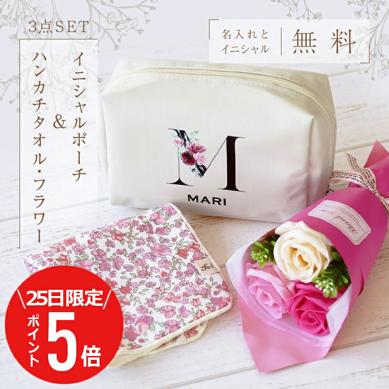 ポーチ サイズ:約170×100×70mm 素材:ポリエステル 他 ハンカチ サイズ:20cm×20cm 中国製 素材:綿100% ブーケ サイズ:約19x9x6cm ・ 石鹸(観賞用)※石鹸・入浴剤としてのご利用はできません。 ・ グリーン(葉類)・包装紙・リボン&アクセサリー等副資材は予告なく変更になる場合があります。 ・ 花びらに小さい黒い点が付く場合があります。生産上どうしても避けられません。ご了承ください。 名入れ お名前は「入力欄」へご記入下さい。 ローマ字のみ10文字まで 備考 ※花柄ハンカチにつきましては、入荷状況により、予告なく色味・柄・タグ等の仕様を変更する場合がございます。予めご了承ください。 ※改良のため、予告なく仕様変更する場合があります。 商品情報 \ 累計3千個以上販売実績の殿堂入り花ギフト / お花好きな女性のために考えたギフトセット。 実用度と特別感両方兼ね備えた、 母の日にもらってうれしいプレゼント♪ 1. 花柄イニシャルデザインポーチ たっぷり入る大容量のスクエア型ポーチに当店オリジナルデザインをプリント。 しっかり自立するので、デスクに置いたままお使いになれます。 アイデア次第で様々な使い方ができるので、実用性も抜群! ・化粧品やメイク道具を入れてコスメポーチとして ・衛生的に持ち歩きたいマスクや消毒液などの除菌グッズを入れるケースとして ・充電ケーブル、イヤホン、スピーカー、モバイルバッテリーなどのスマホ周辺機器をまとめて収納するガジェットポーチとして ・筆記用具や文房具を入れてペンケース代わりとして ・シャンプー・リンスや歯ブラシなどのお泊りセットを入れてトラベルポーチとして 小物をまとめて収納できるから、ごちゃごちゃしがちなカバンの中身をすっきり整理できます。 【イニシャル&お名前プリント】 《 フラワーイニシャル 》 お花をあしらったおしゃれなイニシャルは、当店だけのオリジナル! 自然のぬくもりを感じさせてくれるナチュラルなデザインが女性らしさを演出します。 《 お名前プリント 》 名入れギフト専門の当店スタッフが心を込めてお名前をプリントいたします。 「どうして名前入りが喜ばれるの?」 名前が入ったアイテムは、ただの商品ではなく、贈られた方だけの特別なものになります。 自分の名前が刻まれていると、贈り物としての価値が高まり、より大切に感じるものです。 名前は唯一無二、かけがえのないものです。 当店の名前プリントは長く残り、ずっと大切にお使いいただけます。 2. LIBERTY花柄タオルハンカチ 《 高品質 》 オモテ面はタナローン、裏面は吸水性の良いパイル地を使用。 女性が喜ぶ、上品で華やかなLIBERTY柄のタオルハンカチです。 《 選べる4種類のLIBERTY柄 》 当店オリジナルで、数百種類のLIBERTY柄の中から、女性がもらって嬉しい柄を厳選。 どれも素敵で華やかなデザインです。お気に入りの柄をお選びいただけます。 3. ソープフラワーブーケ まるで本物のお花のような美しさ。 花びら一枚一枚がせっけんでできている観賞用の花束です。 顔を近づけて感じる、やさしくほのかな香り。 もちろん、生花のように水替えなどの手間がかかりません。 ※香りは時間と共に薄れていきます。 枯れることのないお花なので、プレゼントにもぴったりです。 それぞれ色の異なる3輪のバラが花束に。 【選べる4種のカラー】 ・フランボワーズ×ピンク 女性好みナンバー1はやっぱりピンク。 華やかな印象です。 ・ブルー×ブルー coolな女性にぴったりな青色。 大人な印象です。 ・オレンジ×オレンジ 元気いっぱいビタミンカラー。 アクティブな女性におすすめ。 ・グリーン×グリーン 癒し系グリーンカラー。 お疲れ気味の方におすすめです。 ・パープル×ピンク 落ち着いた優しい雰囲気を持つカラーです。 ・カーネーション×ピンク 母の日といえばやはりカーネーション。 もらってうれしい記念日フラワー♪ どの組み合わせも鮮やかで美しい色合いに心惹かれます。 ≪こんなシーンにおすすめ≫ 女友達への誕生日プレゼントに 彼女へのクリスマスやホワイトデーのギフトとして お母さん、ママ、母親、義母への日頃の感謝を込めて 30代〜70代の母の日プレゼントに 上司、先輩、後輩への転勤祝い、昇進祝い、定年退職、退職祝いのギフトとして 【 ココロを贈る 名入れギフトOkulu 】 当店は名入れギフト専門店として、静岡に本社を構える会社です。 私たちは「心を届ける名入れで、贈る人も贈られる人も笑顔になるプレゼント」をモットーに、 長年にわたる経験と専門知識を活かして、製品やサービスを丁寧に作成しています。 ぜひ、安心してご利用くださいませ。 当店の 名入れ 名入り 名前入れ 名前入り は下記の用途にお選びいただいています。 【年間お祝い関連】 2025 / お年始 / 成人祝い / バレンタイン バレンタインデー / ホワイトデー / 卒部 卒業 記念 / 卒業式 / 卒団記念品 / 卒業記念品 / 卒園式 / 入学式 / 入園式 / 母の日 / 父の日 / お中元 / 敬老の日 / ハロウィン / クリ