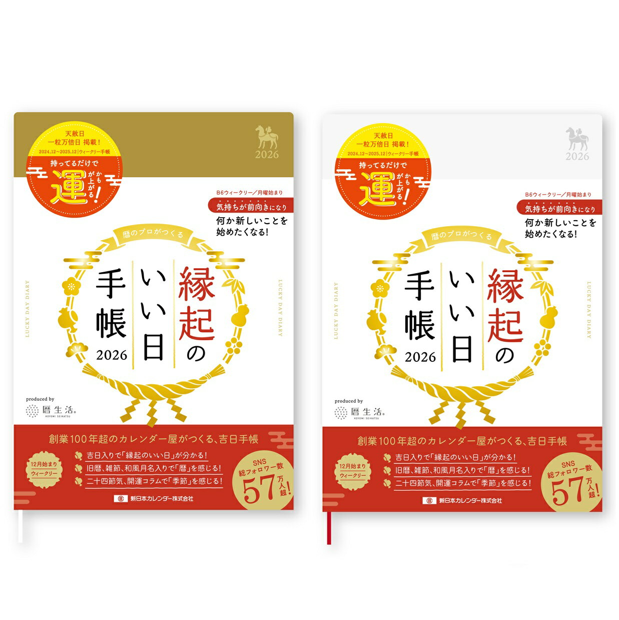 創業100年のカレンダー屋がつくる、縁起のいい情報満載の手帳です。お天道様が味方してくれる日、天赦日(てんしゃにち)。一粒が万倍になって実る日、一粒万倍日(いちりゅうまんばいび)。気持ちが前向きになり、何かを始めたくなるダイアリーです。 プライベートはもちろん、仕事でも使えるシンプルなデザインです。仕様はウィークリーレフトで、右側のメモ欄は文字を書くにもイラストを描くにも使い勝手の良いドット方眼になっております。 PVCのカバーがついているので、カバンに入れても簡単に折れ曲がったりしません。 創業100年超のカレンダー屋がつくる、季節や縁起のいい日情報 満載の手帳 2026 お天道様が味方してくれる日、天赦日(てんしゃにち)。 一粒が万倍にもなって実る日、一粒万倍日(いちりゅうまんばいび)。 気持ちが前向きになり、何かを始めたくなるダイアリーです。 プライベートはもちろん、仕事でも使えるシンプルなデザインです。 気持ちが前向きになり、何かを始めたくなるダイアリー 暦には、たくさんの"縁起のいい日"があります。例えば「天赦日(てんしゃにち)」。 字のごとく、天が赦(ゆる)す日という意味で、暦の上でいちばん縁起がいい日だといわれています。 縁起のいい日には、新しいことをはじめたり、前からやってみたいと思っていたことに挑戦してみたりするのもいいですね。 お客様の声をもとに昨年から一部リニューアルし、今年も前向きになれる縁起のいい日を集めた手帳をつくりました。 1.吉日入りで「縁起のいい日」が分かる! ・大安…六曜のうちのひとつで「大いに安し」の意味 ・天赦日…神様が天に昇りすべてのものを赦(ゆる)す日 ・一粒万倍日…一粒のモミが万倍になって実る日 ・寅の日…虎の毛皮が金色であることから、金運アップが期待できる日 ・巳の日、己巳の日…幸福と財産の神様、弁財天の使いである蛇の日 2023年版は、甲子、鬼宿日、天一天上を新たに加えました。 ・甲子(きのえね)…六十干支の一番始めにくる日で、金運・財運・出世運・商売繁盛アップが期待される日 ・鬼宿日(きしゅくにち)…この日は鬼が宿にいて出てこないので、長寿を祝うに日には最適 ・天一天上…方角をつかさどる天一神が天上に行き、方角の禁忌がなくなるため、どこへ行ってもよいとされる日 を掲載しています。 また、縁起のいい日が重なる日は、打ち出の小槌マークでわかりやすく表現しています。 2.旧暦、雑節、和風月名入りで「暦」を感じる! 節分、八十八夜、入梅など季節の移り変わりの目安となる雑節や、 月の満ち欠けマーク(新月、満月、上弦、下弦)を掲載。 言葉で「暦」を感じていただくことができます。 3.二十四節気、開運コラムで「季節」を感じる! イラストレーター、エッセイストの平野恵理子さんによる、季節のコラムを掲載。 ・春分に最高の運気を ・夏の始まりの満月 ・年の初めの大吉日 など、その数なんと71コラム! へーっという内容や、試してみたくなる内容まで。季節に合わせて紹介しているので、身の回りの事象と重なり楽しんでいただくことができます。 「ひな祭り」「七夕」などおなじみの行事から、「サンマ」「牡蠣」といったその時期に食べたい運気を上げる食べ物、他にも「カエルの合唱」「紅葉狩り」など読んで楽しいコラムが盛りだくさんです! 土日が一目でわかりやすいデザインになっています。 さらに、『今月のやりたいこと』を書くスペースをつくりました。 始めよう!と目標を立てても、つい忘れがちになってしまいますが、よく目にする手帳に書いておけば心に留めておくことができます。 「今月の一粒万倍日には○○を始める!」など、やりたいことを書いてみてくださいね。 その他にも、その月の願い達成度や幸福度、ラッキーだった日も書き留めることができます。 最初のページには一年の目を書くスペースもあります。是非ご活用ください。 予定がたっぷり書き込める!ウィークリータイプ 1か月の予定を1ページで確認できるマンスリーカレンダーに加え、週ごとの予定を書き込めるウィークリーカレンダーもついています。 パタンと180度開く糸綴じ製本で作っていますので、どのページもフラットに開きます。 「金色(きんいろ)」 「真珠色(しんじゅいろ)」 表紙には、午が箔押しされています。 キラッと光るワンポイントがかわいらしく、縁起のいいモチーフなので持っているだけで前向きな気持ちになれそうです。 女性でも男性でも性別を問わず、またプライベートはもちろん、仕事でも使えるシンプルなデザインです。 【暦生活オリジナル】縁起のいい日手帳2026|ウィークリー手帳B6 ●表紙:PVCカバー ●サイズ:B6判 H182×W128mm(中身) ●ページ数:176P スピン1本付 生産地:日本 ●単品重量:約235g 【収録内容】 ・吉日解説ページ ・二十四節気解説ページ ・年間カレンダー ・縁起のいい日早見表 ・マンスリーページ(2025年12月~27年1月) ・ウィークリーページ(2025年12月~26年12月) ・ドット方眼ノート(