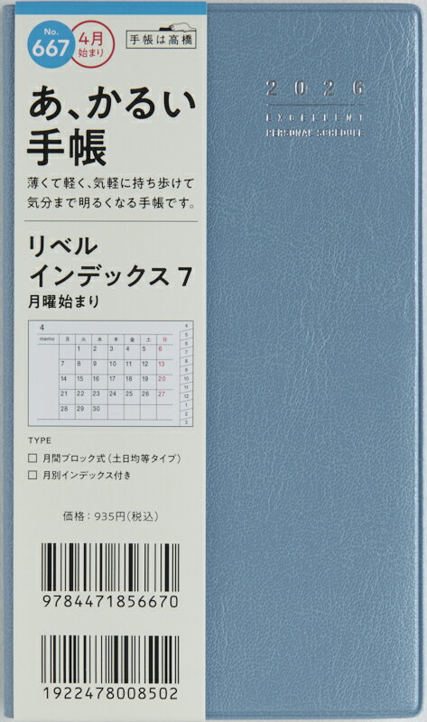 商品名 ・No.667 リベル インデックス 7 月曜始まり ペールブルー 手帳判 詳細 ・始まり年月 :2026 4月始まり ・種類 :ビジネス手帳 ・品番 :84471_667 ・サイズ :A6 ・メーカー名 :TAKAHASHI / 高橋書店 ・フランス語の"libert (リベルテ)"(自由)が名前の由来のリベルシリーズは、小さい・軽い・開きやすいが特徴のロングセラー手帳。 ・レイアウト&カラーバリエーションも豊富です。 シンプル&スマート手帳 月間ページのみ掲載されたシンプルなマンスリータイプ。 ・月ごとにスケジュール管理ができれば充分、という方にぴったりです。 ・月別インデックスが付いていて、開きたい月がすぐ開けます。 一冊目にはもちろん、趣味用のサブ手帳としてもオススメ。 ・豊富なカラーバリエーションからお好きなカラーをお選びいただけます。 ★月間ページ★1〜12月の各月の後ろには、横ケイメモが2ページずつ付いています。 ・ ・★週間ページ★横ケイメモと方眼メモページが付いているので、月間ページに書き足りなくても安心! ・★商品詳細★ ・【曜日始まり】月曜始まり 【タイプ】マンスリー 【月間ページ記入形式】ブロック式 【サイズ】手帳判(縦:156mm×横:91mm) 厚さ:7mm 重さ:90g 【掲載期間】月間:2026年3月1日〜2027年6月30日 ・【ページ数】64 【付録】 年齢早見表 方眼メモ<別冊> 横ケイメモ 方眼メモ 切り取りメモ <別紙>なしWEB付録:有 ↑抜群の収納力!インナーキャリング↑↑ショルダーストラップ↑↑当店オリジナル★バースブックノートはこちら↑↑ロルバーンガチャ↑↑お買い物の相棒↑↑何枚でも欲しくなる!新柄続々入荷↑↑ごほうびスタンプやスケジュールスタンプなど↑↑仕事にも、お勉強にも、家事にも必須↑↑大好きなあの人の大好きなところをとことん書き出そう!!↑おすすめ商品かわいい&おしゃれなシール10枚セット1,320yenかわいい&おしゃれなシール30枚セット3,850yenサマーシール 10枚セット1,540yenクリスマスシール 10枚セット1,320yenかわいいシール詰め合わせ30枚セット+6枚おまけ付き5,940yenかわいいシール詰め合わせ50枚セット+15枚おまけ付き9,900yen↑当店限定★オリジナルシステム手帳はこちら↑ カテゴリー ・分類 :ビジネス手帳>マンスリー>月間式(月間ブロック) ・分類 :サイズで探す>ビジネス手帳>A6 ・分類 :ブランド名で探す>高橋書店(TAKAHASHI)>ビジネス手帳\高橋手帳 ・分類 :デザインで探す>ビジネス手帳>ビジネス定番手帳 ・分類 :用途・機能で探す>ビジネス手帳>ビジネス定番手帳 935円 税込 送料別 カードOK レビュー2件 手帳のタイムキーパー ![]() | ||