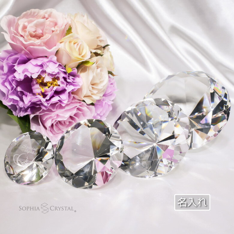 ラッピング、メッセージカードについて その他、クリスタルペーパーウェイト一覧 ガラスについて ガラス・クリスタル製品は材料の特質上、内部に小さな気泡や不純物が見られる場合がございます。 また、素材その物の成型時に、研磨あと、筋、気泡による穴、カケなどが発生いたします。 透明度の高い美しいクリスタルを作るために致し方ないものとしてご了承いただきますようお願い申し上げます。 制作の流れ 商品説明 説明 極めて透明度の高いクリスタルガラスに、職人が手作業でダイヤモンドカットを施したオブジェです。 結婚祝い、開店祝い、表彰トロフィーなどの記念品や、ご自宅用のオブジェとして、飾って美しいクリスタルダイヤモンドは人気です。 サイズは4サイズ展開でお客様の用途・ご予算に合わせてお選びいただけます。 ショップ名を彫刻できるので、ネイルサロンの写真撮影で使う小道具にもお勧めです。 材質 エコロジークリスタルガラス サイズ 【特大 SY-1】直径12cm 【大 SY-2】直径10cm 【中 SY-3】直径8cm 【小 SY-4】直径6cm 包装 化粧箱入り 用途 結婚祝い、撮影小道具、退職記念、周年記念、社内表彰、永年勤続表彰、優秀賞、ゴルフコンペ、誕生日祝い、ギフト 備考 ※オリジナル彫刻で世界でひとつだけのオリジナルの記念品が製作できます。 ※価格に含まれるもの (商品代金・校正代金・彫刻代金) (ロゴマークなど別途データを作成する必要がある場合には別途費用がかかる場合がございます。) 4,345円 税込 送料別 カードOK レビュー21件 名入れギフト専門店SophiaCrystal ![]() | ||