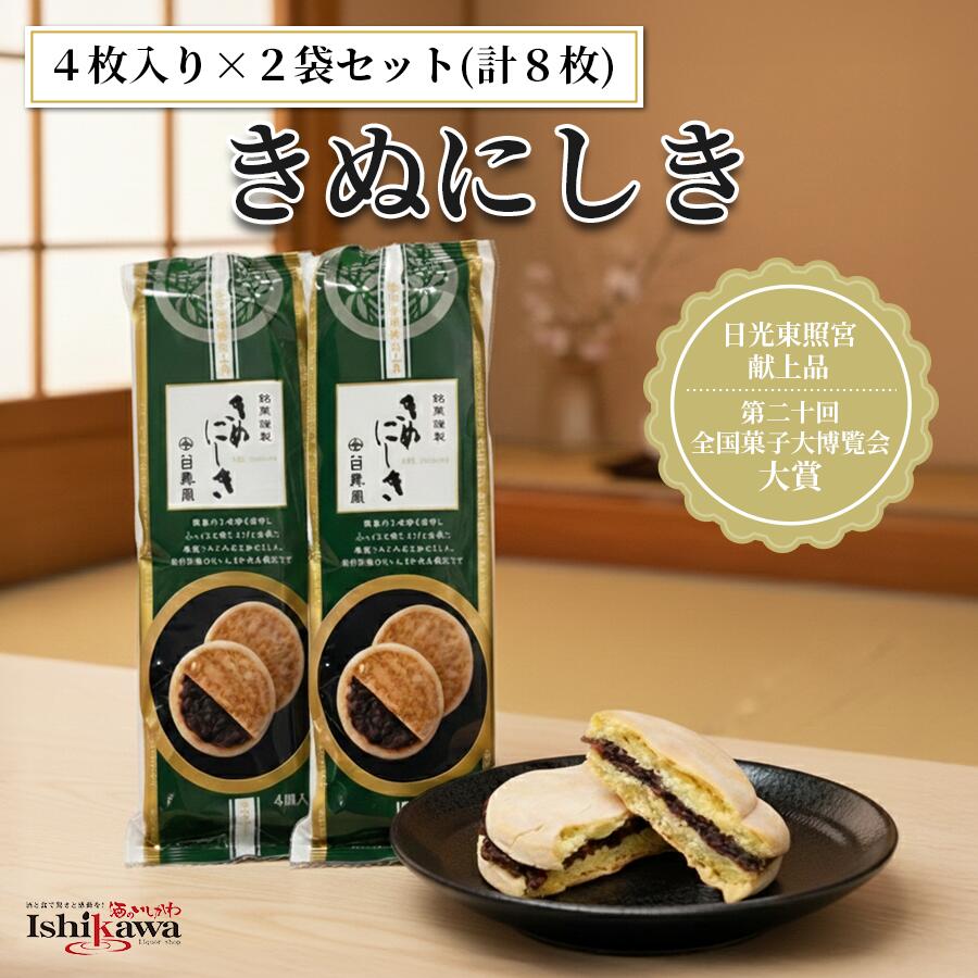 日光東照宮献上菓子 きぬにしき 第二十回全国菓子大博覧会 大賞受賞 格式と伝統が息づく、日光銘菓。 ■ 商品について 国産小麦粉を使用し、ふんわりと焼き上げた生地。 その中に包み込んだのは、丁寧に炊き上げた厳選小豆。 和のやさしさと洋の軽やかさが調和した、 しっとり上品な味わいが特徴です。 40周年を記念して誕生した特別な逸品。 大切な方への贈り物や、特別なひとときに。 ■ セット内容 きぬにしき 4枚入り × 2袋セット ■ 商品詳細 原材料名 砂糖(国内製造)、小麦粉、小豆、卵、還元水飴、マーガリン、米粉、澱粉、食塩/トレハロース、膨張剤、香料、乳化剤、着色料(カロテン) (一部に小麦・卵・乳成分・大豆を含む) 内容量:4枚入×2袋 保存方法:直射日光・高温多湿をお避け下さい アレルギー物質:卵・乳・小麦・大豆 ※本品製造工場では、胡麻、くるみ、山芋、ゼラチン、アーモンドを含む製品を製造しております。 1,324円 税込 送料込 カードOK ワイン&ビール通販 酒のいしかわ ![]() | ||