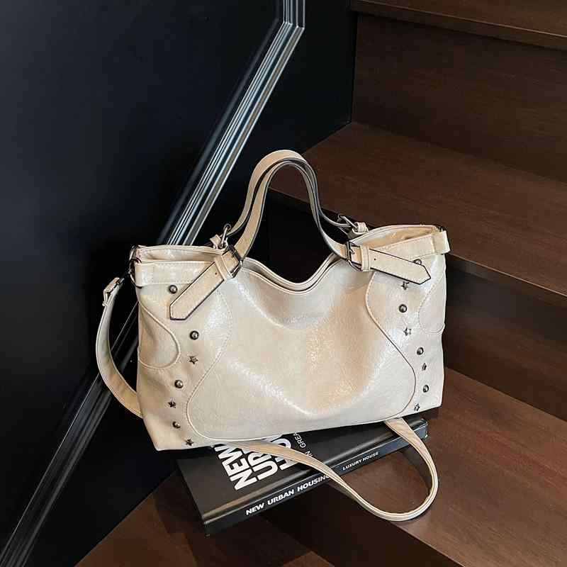 1802. 【予約販売5~12営業日での発送】 トートバッグ レディース 大容量 A4対応 PUレザー リベット バイカースタイル 肩掛け 斜め掛け ファスナー開閉 外ポケット付き 普段使い 通勤 通学 トレンド ・カラー展開: 浅カーキ、ワインレッド、ブラウン、ブラック・スタイル: トレンド・主な素材: PU・バッグのタイプ: トートバッグ・バッグサイズ: 大型・デザイン要素: リベット・裏地素材: ポリエステル・バッグの形状: 横長スクエア型・開閉方法: ファスナー・内部構造: ファスナーポケット、証明書ポケット・硬さ: ややソフト・外ポケットの種類: 立体ポケット・用途: 日常使い・ショルダーストラップ: 1本 5,230円 税込 送料込 カードOK モズラボ ![]() | ||