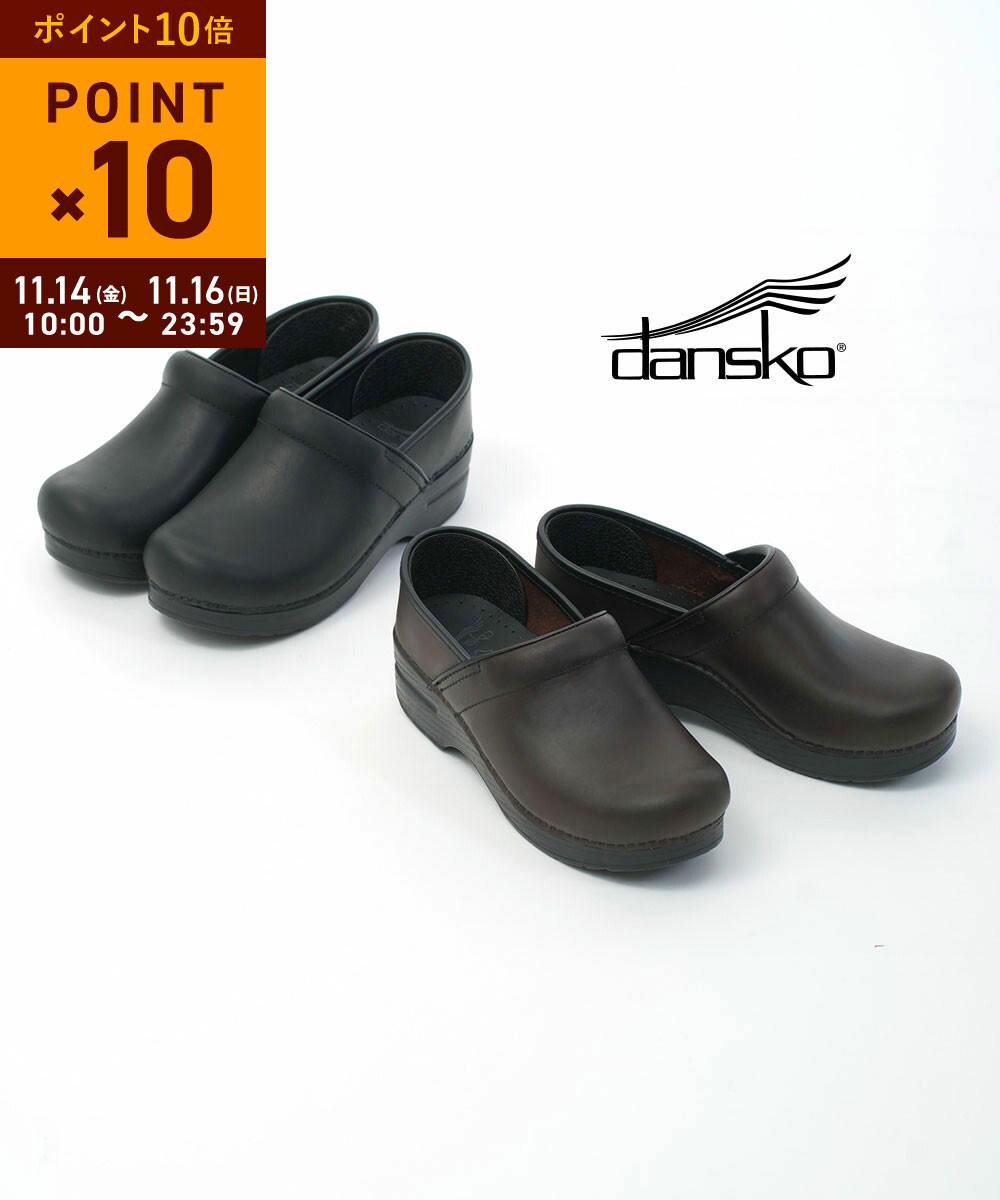 dansko ダンスコ Professional プロフェッショナル クロッグス サボ サンダル ブランド:dansko(ダンスコ) 品番:Professional(プロフェッショナル) 生産国:ベトナム アッパー素材:black、antique brown = オイルドレザー(牛革)、white = ボックスレザー(牛革) ソール素材:ポリウレタン ヒール高:約5cm color:black(ブラック)、antique brown(ブラウン)、white(ホワイト) size:35(22.5~23cm)、36(23~23.5cm)、37(23.5~24cm)、38(24~24.5cm)、39(24.5~25cm)、40(25~25.5cm) dansko(ダンスコ)を代表するモデル、PROFESSIONAL(プロフェッショナル)。 シンプルで飽きのこないデザインの定番クロッグスです。 コロンとした愛嬌のあるルックスに、開放感のあるゆったりとした履き心地。 クッション性に優れた厚みのあるアウトソールが足の負担を軽減し、快適な歩行をサポートしてくれる一足。 素足はもちろん靴下との相性も良く、季節を問わず大活躍してくれると思います。 dansko(ダンスコ)は1990年にアメリカ・ペンシルベニア州で生まれたシューズブランド。 デンマーク出身の創業者の方は靴とは縁もゆかりもない、馬の調教師をされていた人だそうです。 故郷であるデンマークに馬を買い付けに行った際に見つけたクロッグスを、馬の品評会で友人に向けて売り始めたことがブランド設立のきっかけになったとのこと。 ブランド名である「dansko(ダンスコ)」は、「デンマークの靴」という意味。 アメリカで販売するために20年間にわたって改良を重ね完成した靴は、レストランや医療機関など主に「立ち仕事」で働く人々の間で人気を博し、機能性とデザイン性を両立した靴として今では世界中で愛されています。 カラーバリエーションは、ブラック、アンティークブラウン、ホワイトの3色展開。 ブラックとアンティークブラウンは、表面に軽くバフィングを施したオイルレザー。 ムラのあるアンティークな素材感とオイルレザーならではの撥水性が特徴です。 ホワイトはマットな仕上がりのスムースレザー。 こちらも牛革に特殊加工を施した素材で、耐久性・撥水性に優れています。 サイズ感はその見た目に違わずゆったりとした履き心地。 甲周りにはやや絞りを効かせフィットさせることで、指先の開放感を存分に活かした設計になっています。 ヒール高は約5cm。 前底部分にも約1.5cmの厚みを持たせたウェッジソールタイプで、ヒール傾斜は少なく、またクッション性に優れています。 ソールのつま先部分と踵(かかと)部分を反らせることで、分厚いソールでも足運びはスムーズです。 履き口には厚手のクッションパッドを使用し、新品時から柔らかな足当たり。 インソールには防菌・防臭加工を施したレザーフットベッドを使用。 足裏の形に合わせて凹凸を持たせることで、歩行時のフィット感を高めてくれます。 厚みのあるアウトソールはクッション性に優れ、歩行時の着地衝撃から足や腰を守ってくれます。 リピーターのとても多いダンスコですが、実際に店頭でユーザーの方々からお話をお聞きしていると、このクッション性の良さがユーザーの方を虜にする一番の要因だと感じます。 ○*black(ブラック)、antique brown(ブラウン)につきましては、オイルドレザーの特性上、納品時期によって色の仕上がり、深さ、ムラには個体差がございます。 予めご了承お願い申し上げます。 色について気になられます場合は、送らせていださせてきます商品の画像をご用意いたしまして、メールをさせていただきますので、ご遠慮なくお申し付けくださいませ。 ◆サイズについて ○全体にゆったりめの足入れの靴です。 ○普段お選びのサイズでお選びいただくことをお勧めします。 ○甲をフィットさせて、指先にゆとりがある状態(指が動かせる状態)で合わせると良いと思います。 ○歩いた時にカカトが少し浮くことがあるかもしれませんが、 これはダンスコの靴のデザイン特性の為(ソールとカウンターの形状の為)で、問題ありません。 ○幅のない華奢な足の方は普段より1サイズ下にされても良いかと思います。 ・スタッフAの試着感について 普段の靴選びは24cmが中心。パンプスはたまに23.5cm。 でも、インポートの細めのスニーカーなどは、24.5cmを選ぶこともあります。 足長:23.7cm 足囲:23.3cm(Eウィズ)やや甲高足です。 普通の厚みの靴下で履いて、38(24~24.5cm)がきつ過ぎず緩すぎず、ちょうど良い感じで履けました。 ぶ厚めの靴下だと履き口がちょっと窮屈、でも伸び馴染めば気にならなくなりそうです。 1サイズ下の37(23.5~24cm)は、なんとか履けますが、履き口が窮屈、指先もゆとりが無く当たっています。 1サイズ上の39(24.5~25cm)は、ぶ厚い靴下で履いてゆったり楽に履ける感じです。 普通の厚みの靴下で履くと、全体にぐすぐす大きいです。。。 甲が履き口で止まらず足が前に入り込む感じで、スリッパで歩いている感じで歩きづらいです。 私はそんなにぶ厚い靴下は履かないので、普段通りのサイズ38(24~24.5cm)にします。 *試着感には個人差があります。あくまで参考情報としてご参照くだ