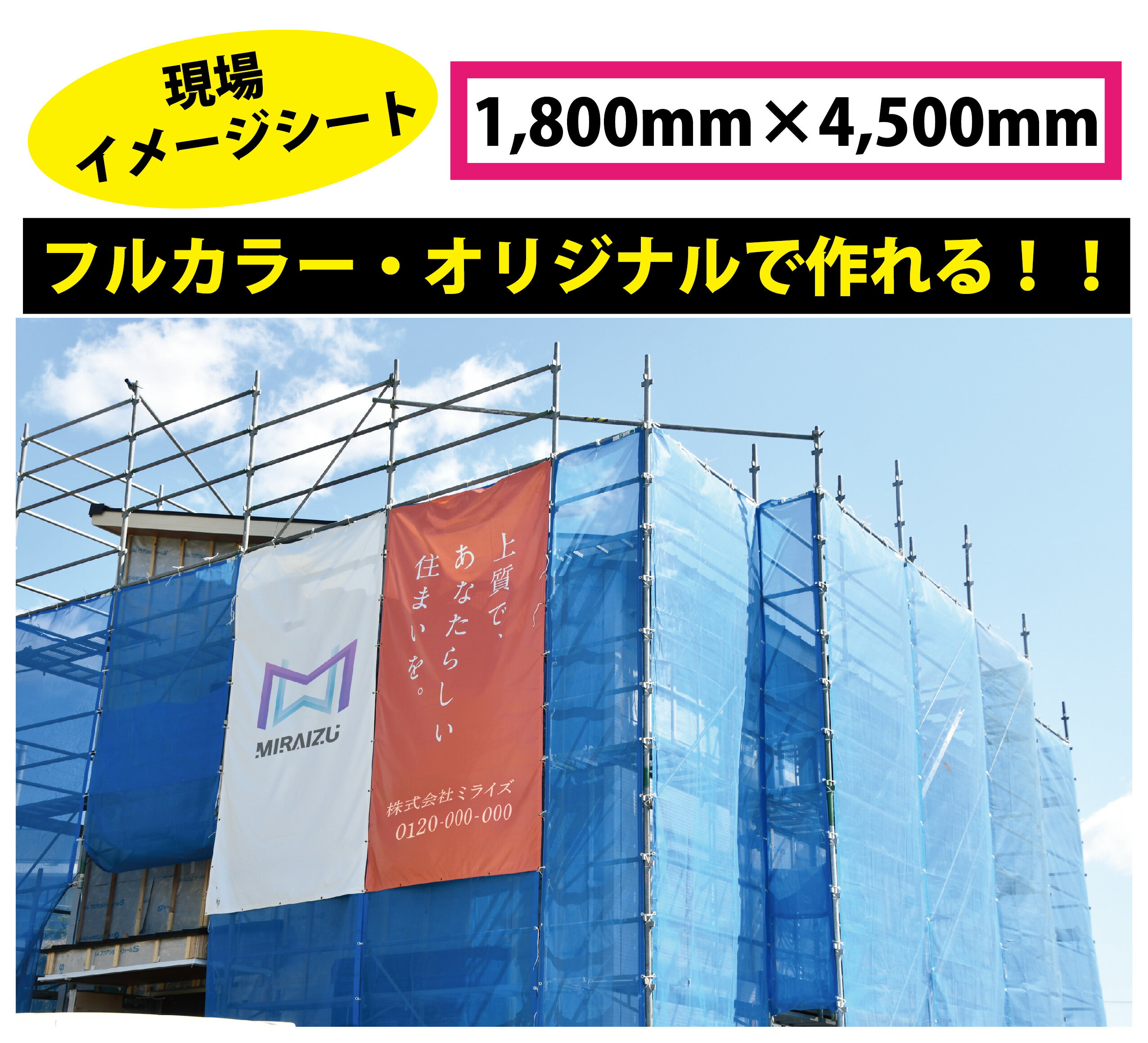 商品情報サイズ横幅 1,800mm × 高さ 4,500mm素材ターポリン : ビニール素材印刷フルカラー印刷注意事項モニターの発色の具合によって実際のものと色が異なる場合がございます。ご了承ください。色指定がある場合は、DIC番号またはCMYKにてご指定ください。ただし、指定していただいた場合でも、色は近似色での出力になります。予めご了承ください。複雑なデザイン・こだわりの強いデザインに関しては、技術的な理由でお断りする場合がございます。著作権・肖像権に関しては、お客様の自己責任のもとで、ご注文をお願いします。データ入稿のお客様へカラーモードはCMYK、文字には全てアウトラインをかけてください。画像は原寸大で100dpi~150dpi程度で作成してください。塗り足しは3cm付けてください。現場イメージシート 印刷名入れ可 ターポリン製 オリジナル現場シート 懸垂幕 横断幕 養生幕 養生シート 広告宣伝幕 大判厚手シート 垂れ幕 建築現場シート 住宅用シート 建設シート 囲い込みシート 白地シート 丈夫長持ち 【 現場イメージシート ターポリン 1枚~】 現場イメージシート ターポリン オーダー印刷 5 11,690円 税込 送料込 カードOK つくーるマーケット 楽天市場店 ![]() | ||