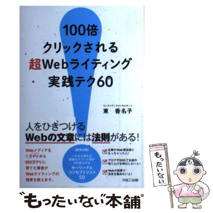 1302. 【メール便送料無料、通常24時間以内出荷】 【中古】 100倍クリックされる超Webライティング実践テク60 / 東 香名子 / パルコ [単行本]【メール便送料無料】【最短翌日配達対応】 著者:東 香名子出版社:パルコサイズ:単行本ISBN-10:4865062114ISBN-13:9784865062113■こちらの商品もオススメです ● 主婦もかせげるパソコンで月収30万 ホームページの新ビジネス・アフィリエイト体験記 / 小林 智子 / 祥伝社 [単行本] ● 一瞬で心をつかむ77の文章テクニック / 高橋 フミアキ / 高橋書店 [単行本(ソフトカバー)] ● アフィリエイトの達人養成講座 基本からSEO対策までバッチリ学べる / 伊藤 哲哉, 坂巻 隆之, 今村 仁彦, 鈴木 将司 / 翔泳社 [単行本(ソフトカバー)] ● 最新マーケティングの教科書 2017 / 日経デジタルマーケティング / 日経BP [単行本] ● あっという間に月25万PVをかせぐ人気ブログのつくり方 これだけやれば成功する50の方法 / OZPA / 秀和システム [単行本] ● テクニカルガイドforマジックザギャザリング / George H.Baxter, Larry W.Smith, 矢吹 幸治 / 新紀元社 [単行本] ● プロフェッショナルWebライティング コンテンツの文章品質を上げるために必要な知識 必要 / 松下 健次郎 / 技術評論社 [単行本(ソフトカバー)] ■通常24時間以内に出荷可能です。※繁忙期やセール等、ご注文数が多い日につきましては 発送まで48時間かかる場合があります。あらかじめご了承ください。 ■メール便は、1冊から送料無料です。※宅配便の場合、2,500円以上送料無料です。※最短翌日配達ご希望の方は、宅配便をご選択下さい。※「代引き」ご希望の方は宅配便をご選択下さい。※配送番号付きのゆうパケットをご希望の場合は、追跡可能メール便(送料210円)をご選択ください。■ただいま、オリジナルカレンダーをプレゼントしております。■お急ぎの方は「もったいない本舗 お急ぎ便店」をご利用ください。最短翌日配送、手数料298円から■まとめ買いの方は「もったいない本舗 おまとめ店」がお買い得です。■中古品ではございますが、良好なコンディションです。決済は、クレジットカード、代引き等、各種決済方法がご利用可能です。■万が一品質に不備が有った場合は、返金対応。■クリーニング済み。■商品画像に「帯」が付いているものがありますが、中古品のため、実際の商品には付いていない場合がございます。■商品状態の表記につきまして・非常に良い: 使用されてはいますが、 非常にきれいな状態です。 書き込みや線引きはありません。・良い: 比較的綺麗な状態の商品です。 ページやカバーに欠品はありません。 文章を読むのに支障はありません。・可: 文章が問題なく読める状態の商品です。 マーカーやペンで書込があることがあります。 商品の痛みがある場合があります。● リピーター様、ぜひ応援下さい(ショップ・オブ・ザ・イヤー) 299円 税込 送料別 カードOK レビュー1件 もったいない本舗 楽天市場店 ![]() | ||
