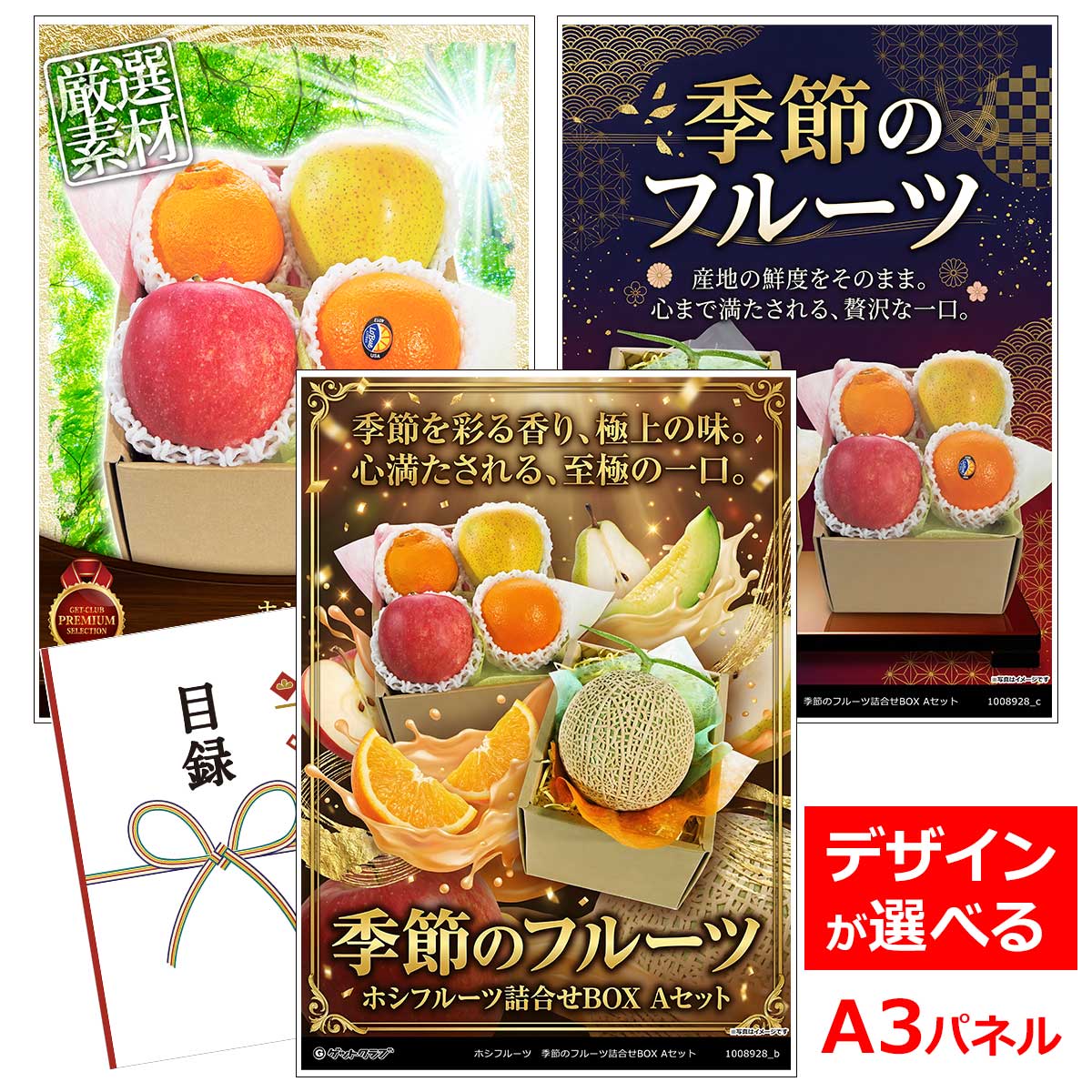 ■各種イベントに合わせて 目録 景品 A3パネル付きが1000種類以上 景品 ビンゴ セット ビンゴ景品 景品セット 結婚式二次会 二次会景品 2次会 披露宴 ゴルフ 賞品 ゴルフコンペ コンペ景品 ドラコン ニアピン賞 参加賞 協賛品 忘年会 新年会 歓送迎会 社員旅行 研修旅行 社内懇親会 ボーリング大会 花見 周年記念 従業員への感謝品 ご来店記念 プレゼント抽選 抽選プレゼント アンケート謝礼 ご紹介キャンペーン 販促キャンペーン 展示会 セミナー 会社説明会 住宅展示場 ハウスメーカー 来場特典 成約記念 と使い方は自由!!果物の香りと味わいで季節の旬をお届けします 市場に35年以上通い続けるフルーツの目利きが、お客さまにご注文をいただいてから一品ずつ厳選した旬のフルーツをお届けします。 その時期と旬の味わいをお楽しみいただけるフルーツを詰合せ、お届け致します。フルーツはもちろんそのままでも、スイーツやお料理に添えたりソースにもおすすめです。 内容量:季節のフルーツ詰合せ(1種〜4種ほど) 4,400円 税込 送料込 カードOK レビュー37件 景品ゲットクラブ楽天市場店 ![]() | ||