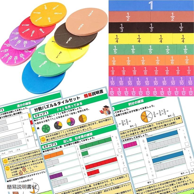 苦手になりがちな算数の分数を可視化してわかりやすく学べます。分数の概念をカラフルなカラーのバリエーションがあるタイルやパズルで見て視覚で捉え、触れて触覚で学ぶことで分数への苦手意識を持たずに楽しく学ぶことができます。「1」、「2分の1」、「3分の1」、「4分の1」、「5分の1」「6分の1」、「8分の1」、「10分の1」、「12分の1」を作成でき、タイルとパズルそれぞれ51個ずつのパーツがセットになっています。裏側がマグネット仕様になっているので冷蔵庫やホワイトボードに貼り付けて遊びながら学ぶことができます。まだ分数が小学校で始まらない年齢のお子さんへの早期のインプットにも使用できます。親御さんの声かけの中で分数の「2分の1」などの単語を脳へ早期にインプットすることによって小学校の算数での授業で抵抗なく学ぶことができます。柔らかい素材で切り離せるように切り込みが入っているのでお子さんと一緒に切り離す事で声掛けをしながらの工作も可能です。家庭学習で子供に分数は教える事が不安がある方でも安心の保護者用テキストブックが付属しています。テキストブックのページ数は大容量の44ページ保護者用テキストブックには「おうちの方へ」で説明書きがあり、取り組みの「ねらい」、具体的な「声かけ例」まで記載されています。保護者用テキストブックは子供と一緒に読めるように保護者向けの部分以外は全ての漢字にルビがふってあるのでひらがなが読めれば子供だけでも取り組めるように考えれています。対象年齢:6歳以上内容品:分数パズル、分数タイル、テキストブック*製品の製造過程で小さな穴がある場合がございます。※ 他ネットショップでも併売しているため、ご注文後に在庫切れとなる場合があります。予めご了承ください。※ 品薄または希少等の理由により、参考価格よりも高い価格で販売されている場合があります。ご注文の際には必ず販売価格をご確認ください。※ 沖縄県、離島または一部地域の場合、別途送料の負担をお願いする場合があります。予めご了承ください。※ お使いのモニタにより写真の色が実際の商品の色と異なる場合や、イメージに差異が生じることがあります。予めご了承ください。※ 商品の詳細(カラー・数量・サイズ 等)については、ページ内の商品説明をご確認のうえ、ご注文ください。※ モバイル版・スマホ版ページでは、お使いの端末によっては一部の情報が表示されないことがあります。すべての記載情報をご確認するには、PC版ページをご覧ください。苦手意識を持ってしまう前や既に苦手意識を持ってしまっていても大丈夫。。 分数が分かりやすいパズルになりました。 「1」と同じにするにはどの組み合わせにすればいいのか? 宿題や学習プリントをこのパズルやタイルを見ながらすればより理解が深まります。 2,580円 税込 送料込 カードOK エムラインストア ![]() | ||