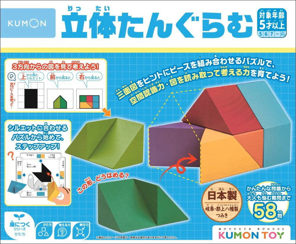 2030. くもん出版 KUMON 立体たんぐらむ 【返品種別B】□「返品種別」について詳しくはこちら□2025年03月 発売※画像はイメージです。実際の商品とは異なる場合がございます。※同一と思われるお客様より大量のご注文をいただいた場合、ご注文をお取り消しとさせていただく場合がございます。【商品紹介】三面図をヒントにピースを組み合わせるパズルで、空間認識力、図から読み取って考える力を育てよう! 上から見たシルエットと、前後左右から見た図を手がかりに、ピースを組み合わせて立体を作るパズルです。ピースには、三角柱2つがねじれた位置でつながっている立体があります。そのため、上から見たシルエットにピースの形を合わせるだけでなく、前後左右から見た立体的な構成やピースの色も考えて組み立てないと、正解は導き出せません。こうしたパズルを通して、「図から読み取り、複数の情報を合わせて考える力」や「空間認識力」を養います。【セット内容】ピース:9種類10個台シート:1枚 問題集:1部【商品仕様】パッケージサイズ : W245×D205×H45(mm)対象年齢 : 5歳〜おもちゃ>おもちゃ・知育>くもん>木のおもちゃ 3,990円 税込 送料別 カードOK レビュー1件 Joshin web 家電とPCの大型専門店 ![]() | ||