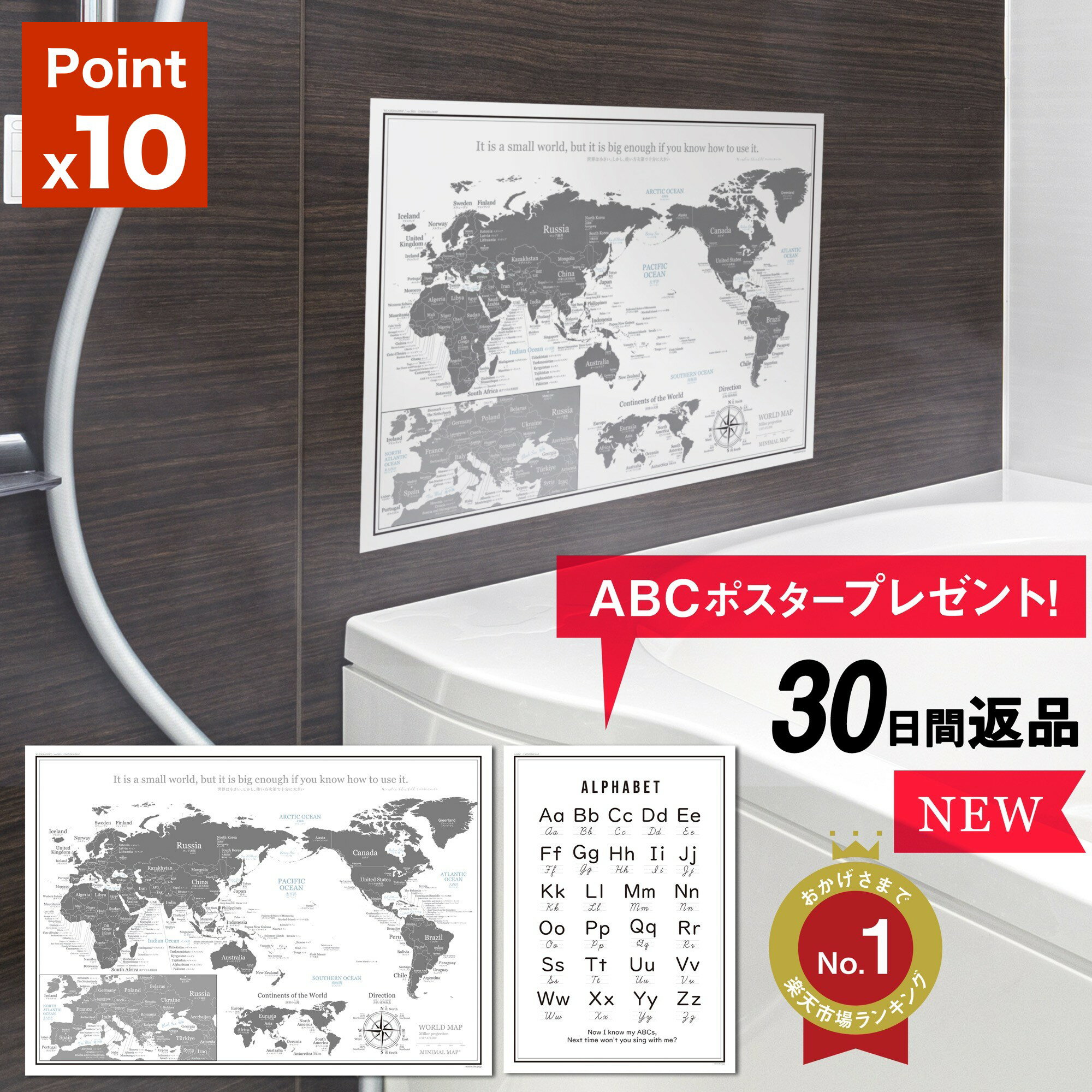 ランキング1位 多数!! (2024年2月23日現在) キッズ・ベビー・マタニティ/おふろ・バス用品/おふろのおもちゃ ランキング リアルタイムランキング1位 2023年11月1日 11:14取得 キッズ・ベビー・マタニティ/おふろ・バス用品/おふろのおもちゃ ランキング リアルタイムランキング1位 2023年4月23日 11:30取得 キッズ・ベビー・マタニティ/おふろ・バス用品/おふろのおもちゃ ランキング リアルタイムランキング1位 2023年4月2日 10:45取得 商品名ミニマルマップ シンプルな世界地図ポスター A3サイズ 【おまけ付き】ABCアルファベットポスター 商品特徴✅ シンプルな世界地図ポスター余分な色・情報を削ぎ落とした、ミニマルデザインなインテリアポスター。✅ 完全防水のお風呂ポスター。リラックスタイムと学習をワンセットに。✅ 英語・日本語の二言語表記なので英語の学習にも。✅ ABCアルファベットポスター付き 表記言語英語・日本語 カラーモノトーン サイズ・内容合計2枚入り ・世界地図ポスター 1枚 A3サイズ(297 × 420 mm) ・ABC アルファベット ポスター 1枚 A4サイズ(210 × 298 mm) 材質ユポ紙 (完全防水) 企画・生産国日本 商品仕様防水ポスター2枚 梱包方法■簡易パッケージ 折り目がつきにくいよう、ゆるく畳んで、厚さ1.5cmのメール便専用ダンボールにてお届けします。 ポスト投函で受け取りもスムーズ。自宅用におすすめ! ■筒パッケージ 丈夫な紙管に、ポスターを丸めて丁寧に梱包。 そのままギフトにも使えます。宅配便でのお届けなので、日時指定やラッピングもOK! 納期・送料買い物かごボタンの付近に記載 注意事項※商品の写真はできる限り実物のお色に近づけるように加工しておりますが、お使いのスマホ、モニター設定、お部屋の照明などにより実際の商品と異なる場合がございます。※商品につきましては商品ページにて仕様をご案内をしておりますが、入荷時期にや製品改良のため予告なくデザイン・仕様が変更になる場合がございます。お届けした商品と商品ページご案内のデザイン・色合い・仕様が異なる場合がございますが、不良ではございません。 あらかじめご了承のうえ、ご注文をお願い致します。*万一、汚れ・折れた状態で到着した場合は、配送業者または当店までご連絡ください。貼って眺めて覚える学習を日常化するモノトーンの世界地図をポスターで、A3 防水(ユポ)仕様、浴室やリビング、書斎や子ども部屋に最適 \今年だけかもしれない最強の4時間/ ブラックフライデー開始4時間 × 0のつく日が重なります! \開始4時間が激アツ!/ \11/20(水)は0のつく日/ 楽天カード決済でポイント4倍! \買い回りで最大P10倍/ \ お得情報が届きます♪ /\ レビュー投稿でプレゼント! / シンプルな世界地図ポスター。 おまけに、ABCポスターも。 完全防水なので、水に濡らしてお風呂の壁やガラスなどに飾れます。 英語と日本語で、国名・首都名を表記。 A3サイズにリニューアルして再販スタート! お風呂の壁に貼れば、リラックスタイムに世界地図を眺めることができます。 ホワイト&グレーのワントーンでシンプルにデザインしました。 リラックスタイムに、次の旅の計画や、ビジネスのアイデアを考えたり。 小さなお子さまには、お風呂で遊びながら地理のお勉強にも。 貼って覚えるを日常に、親子の会話が生まれる学習インテリア。 英日併記で地名がすっと入る世界地図ポスターは、ミニマル設計で視認性に配慮しました。 合成紙ユポの防水A3だからお風呂で使えます。 ホテルライクなデザインだから、リビングや子ども部屋にも馴染みます。 ではフレームやマグネットバーで掲示、浴室では壁に貼ってスキマ時間に復習でき、朝夕のルーティン化を後押し。 学習の導入から受験前の確認まで幅広く対応。 特典としてA4のABCポスター(防水)を同梱、アルファベットの定着も同時にサポートします。 雑誌掲載ありのMINIMAL MAPが、学びとインテリアを両立する1枚を丁寧にお届けします。 ■こちらもおすすめ 1,700円 税込 送料込 カードOK レビュー7件 知育ポスターのミニマルマップ ![]() | ||