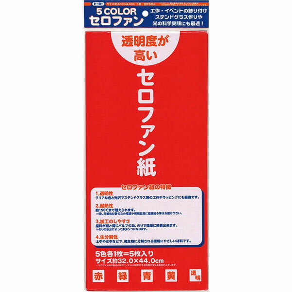 ●1冊(5枚入) ●5色5枚(赤・緑・青・黄・透明) ●透明性(クリアに透けるセロファン紙) ●耐熱性(約190℃まで) ●原料パルプ(糊づけの加工ができますので工作に最適です) ●型式/110800 ●寸法/440(縦)×320(横)mm ●セロハン厚/0.02mm ●色/5色5枚入(赤・緑・青・黄・透明 各1枚) ●質量/174g ※原料パルプ、火には弱いですが熱には約190℃までの耐熱がありますが直接蛍光灯に貼ったりしないでください。 ※ご利用の環境により、実物の色とは異なる場合があります。 220円 税込 送料別 カードOK レビュー2件 教材club T&Y ![]() | ||