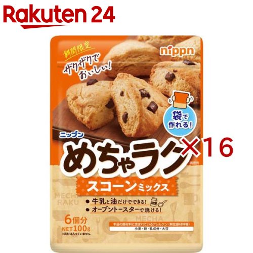 お店TOP>フード>製菓材料>材料キット>スコーンミックス>ニップン めちゃラク スコーンミックス (100g×16セット)【ニップン めちゃラク スコーンミックスの商品詳細】●とにかくラクにお菓子が出来る、おいしく楽しいお菓子作りを応援するデザートミックスです。●おうちにある材料でと少ない道具で調理できるので、片付けも楽ちんです。必要なのは牛乳と油だけ、生地は袋の中で混ぜられます!●外側はサックリでも中はしっとりの理想通りのスコーンがこんなに簡単に作れるのは嬉しい、あなたのお菓子作りの味方になってくれる商品です。【品名・名称】スコーンミックス【ニップン めちゃラク スコーンミックスの原材料】小麦粉(国内製造)、砂糖、植物油脂、乾燥全卵、乳等を主要原料とする食品(バター、乳糖、カゼインカルシウム、食塩)/ベーキングパウダー、乳化剤、香料、pH調整剤、酸化防止剤(ビタミンE)、クエン酸、(一部に小麦・卵・乳成分・大豆を含む)【栄養成分】1袋100gあたりエネルギー:392kcal、たんぱく質:7.9g、脂質:5.9g、炭水化物:76.7g、食塩相当量:0.6g【アレルギー物質】小麦、卵、乳成分、大豆【保存方法】直射日光、高温・多湿の場所を避けて常温で保存してください。【発売元、製造元、輸入元又は販売元】株式会社 ニップン ※2021/1/1より日本製粉から変更※説明文は単品の内容です。リニューアルに伴い、パッケージ・内容等予告なく変更する場合がございます。予めご了承ください。・単品JAN:4902170096868株式会社 ニップン ※2021/1/1より日本製粉から変更102-0083 東京都千代田区麹町4-80120-184157広告文責:楽天グループ株式会社電話:050-5577-5043[粉類] 4,064円 税込 送料別 カードOK 楽天24 ![]() | ||