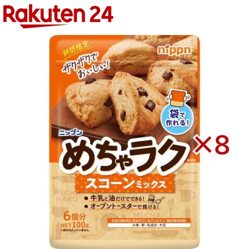お店TOP>フード>製菓材料>材料キット>スコーンミックス>ニップン めちゃラク スコーンミックス (100g×8セット)【ニップン めちゃラク スコーンミックスの商品詳細】●とにかくラクにお菓子が出来る、おいしく楽しいお菓子作りを応援するデザートミックスです。●おうちにある材料でと少ない道具で調理できるので、片付けも楽ちんです。必要なのは牛乳と油だけ、生地は袋の中で混ぜられます!●外側はサックリでも中はしっとりの理想通りのスコーンがこんなに簡単に作れるのは嬉しい、あなたのお菓子作りの味方になってくれる商品です。【品名・名称】スコーンミックス【ニップン めちゃラク スコーンミックスの原材料】小麦粉(国内製造)、砂糖、植物油脂、乾燥全卵、乳等を主要原料とする食品(バター、乳糖、カゼインカルシウム、食塩)/ベーキングパウダー、乳化剤、香料、pH調整剤、酸化防止剤(ビタミンE)、クエン酸、(一部に小麦・卵・乳成分・大豆を含む)【栄養成分】1袋100gあたりエネルギー:392kcal、たんぱく質:7.9g、脂質:5.9g、炭水化物:76.7g、食塩相当量:0.6g【アレルギー物質】小麦、卵、乳成分、大豆【保存方法】直射日光、高温・多湿の場所を避けて常温で保存してください。【発売元、製造元、輸入元又は販売元】株式会社 ニップン ※2021/1/1より日本製粉から変更※説明文は単品の内容です。リニューアルに伴い、パッケージ・内容等予告なく変更する場合がございます。予めご了承ください。・単品JAN:4902170096868株式会社 ニップン ※2021/1/1より日本製粉から変更102-0083 東京都千代田区麹町4-80120-184157広告文責:楽天グループ株式会社電話:050-5577-5043[粉類] 2,053円 税込 送料別 カードOK 楽天24 ![]() | ||