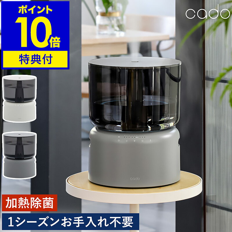 cado STEM 500H加熱除菌オートクリーン加湿器 1シーズンお手入れ不要 加熱除菌で清潔に空気潤う “ 空気をデザインする ”cado史上初の加熱除菌できるオートクリーン加湿器『 cado STEM 500H 』。超音波式と加熱式を融合した特許出願中のハイブリッド加湿テクノロジー「 クリーンヒート 」で、雑菌を99.9%除菌して清潔な潤いを届けます。1シーズンお手入れ不要のイージーメンテナンス設計、さらに電気代は一般的な加熱式加湿器との比較で約1/6と超省エネ。静音性にも優れ、寝室やリビングにもおすすめ。最大500mL/hのパワフル加湿と5Lの大容量タンクで、家族全員に安心を提供する次世代加湿器です。 スペック 品名 cado Humidifier STEM 500Hカドー 加湿器 ステム 500エイチ 品番 / JAN ホワイト:HM-C500H-WH / 4562337507868クールグレー:HM-C500H-CG / 4562337507875 サイズ 約 直径 245mm×高さ 315mm 重さ 約 3.1kg ( 本体のみ ) コードの長さ 約 1.8m 電源 AC 100V 50-60Hz 消費電力 間欠:42( 133 )W、弱:20( 140 )W、強:32( 143 )W、急速:40W※( )内は加熱運転中の消費電力。 タンク容量 約 5L 加湿方式 ハイブリッド式( 加熱式+超音波式 ) 加湿量 間欠:50mL/h、弱:150mL/h、強:350mL/h、急速:500mL/h※室温が20℃の場合。室内の温度や湿度、水温により変わります。 運転音 間欠:39dBA、弱:35dBA、強:37dBA、急速:39dBA※間欠の数値は動作中の最大値です。 適応床面積 木造和室:8.5畳( 14m² )プレハブ洋室:14畳( 23m² )※急速モード運転時。あくまで目安であり、使用状況により異なります。 機能 [ 運転モード ] オートモード:お部屋の状態をセンサーで検知し、自動で加湿量を調節。 ナイトモード:インジケーターを消灯し、加湿量控えめで静かに運転。湿度が約60%以上になると運転を一時停止、約50%以下になると運転を再開。 急速モード:素早く加湿したいときに。運転30分後にオートモードに自動切替。 マニュアルモード:間欠運転 / 弱 / 強 [ オフタイマー ] 1、4、8時間 [ 照度調整 ] 強 / 中 / 弱 / 消灯( タンク下部インジケーター / 操作パネルインジケーター ) ※操作パネルインジケーターは完全に消灯することはできません。 [ イルミネーション ] ・湿度の状態を色で表示:約 50%以上( 青 )、30~50%( 緑 )、30%以下( 黄 )、給水お知らせ( 赤 ) ・グラデーション設定:ゆっくり変化 ・ユーザー設定:任意色点灯 / 任意色ゆらぎ( 1/f ゆらぎ ) ※グラデーション / 任意色ゆらぎ動作中は、照度切替ボタンを押しても明るさの切り替えはできません。 [ 加熱運転 ] ・電源コードを接続し約30分が経過すると加熱運転を開始。水槽部のヒーターが約75℃まで上昇します。( 水槽部に水がないときは給水が行われたあとに加熱運転を開始 ) ・運転停止中でも、水槽部に水がある場合は加熱運転を行います。 ・加熱運転は約1時間。約12時間ごとに自動で加熱運転を繰り返します。 [ 使用できる液剤 ] 別売りのcado専用リキッドのみご使用いただけます。 ・Purio( ピュリオ):高機能電解酸性イオン水 ・フォレストウォーター / シトラスウォーター:香りの専用液剤( タンク、水槽部いずれでも使用可 ) [ 内部乾燥機能 ] ・本体内部( 水槽部 )への送風運転。モードボタン3秒長押しで送風開始、電源ボタンを押すことで終了。 [ 安全装置 ] ・安全機能:タンク検出、異常水位検出、本体動作異常検出、加熱運転異常検出 保証期間 メーカー保証1年 付属品 電源コード、フィルターカートリッジ CT-C500、安全上のご注意、取扱説明書、保証書 お手入れ [ 洗えるもの ]ダクト / リフレクタ / ノズル( ミスト吹出口 )/ タンク内・タンク裏側 / 本体底部のフィルターカバー・エアフィルター※その他の部分は拭き掃除でのお手入れとなります。 備考 [ 給水について ] ・タンクの水は毎日新しい水道水と入れ替えてください。 ・水道水以外の水( 精製水・蒸留水・浄水器の水・アルカリイオン水・ミネラルウォーターなど )、40℃以上の温水、専用液剤以外のアロマオイルなどは使用しないでください。 ・初めて使用する場合や水を補給した直後など、本体水槽部に水がない状態から運転する場合は、適切な水位になってから運転を開始するため、10分程度かかることがあります。 ・ミストの吹出口に水を注がないでください。故障の原因になります。 [ 加熱について ] ・加熱運転中および加熱運転完了後は、本体内の水槽部( 特にヒーター部分 )が熱くなります。タンクの取り外し等はやけどしないようお取り扱いにご注意ください。 ・本体水槽部( 水がたまる内部 )が加熱される構造です。水タンクを加熱する構造ではないため、タンク内の水は熱くなりません。 ・加熱中のミストの温度は約45℃です。 [ フィルターカートリッジ ] 交換目安:約 3~6か月 ※必ず取り付けた状態でご使用ください。取り付けていない状態の場合、水もれの原因になります。 ※フィルターカートリッジの効果がなくなると白い粉が発生し、周囲に付着することがあります。 [ 電源コードを抜いた場合 ] 電源コードを接続して運転開始した場合は、運転開始から30分後に加熱運転を行います
