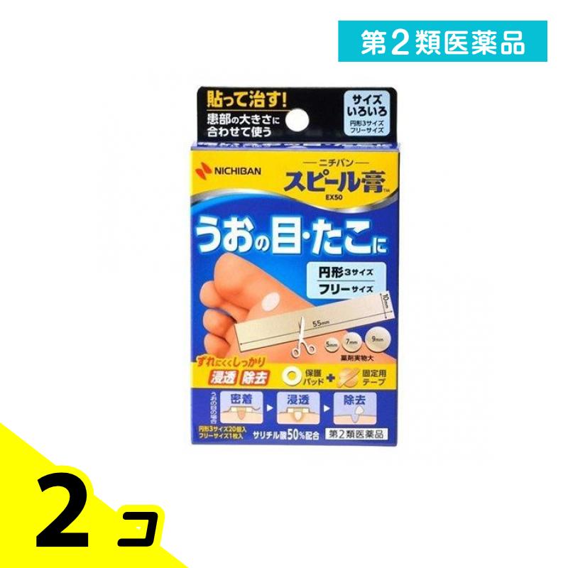 【商品名】 スピール膏 EX50 【効能・効果】 うおの目、たこ、いぼ 【保管上の注意】 (1)直射日光をさけ、なるべく湿気の少ない涼しい所に保管してください。 (2)小児の手のとどかない所に保管してください。 (3)誤用をさけ、品質を保持するため、他の容器に入れかえないでください。 (4)開封後、残った薬剤(スピール膏TMEX50)及び固定用テープ類は、品質保持のため同じ袋には入れず、それぞれもとの袋に戻し、もとの箱に入れて保管してください。 【消費者相談窓口】 お問い合わせ先 お客様相談室 電話:0120-377218 受付時間:9:00〜12:00、13:00〜17:00(土・日・祝日を除く) 【製造販売会社】 ニチバン(NICHIBAN) 【用法・用量】 本品を患部より少し小さめに切って貼り、ズレないように固定用テープでしっかりとめ、2〜5日毎に新しい薬剤と交換してください。 【使用上の留意点】 (1)小児に使用させる場合には、保護者の指導監督のもとに使用させてください。 (2)本品は外用にのみ使用し、内服しないでください。 (3)薬剤部分が健康な皮ふに付着すると、その部分も白く軟化し、痛んだりしますので、患部の大きさより少し小さめの円形のものを選び、そのまま貼れば便利に治療できます。患部に合わない場合にはフリーサイズを適宜切ってお使いください。 ★裏面の<スピール膏TMEX50の上手な使用例>をご覧ください。 (4)薬剤が患部からズレた場合は位置を戻すか、新しいものに交換してください。 (5)固定用テープをお使いの際には、皮ふかぶれやテープのはがれをさけるため、テープを伸ばさずにお貼りください。 【成分・分量】 1m2中 サリチル酸:357g (サリチル酸50%配合) 【成分・添加物 】 生ゴム、石油系樹脂、中鎖脂肪酸トリグリセリド、精製ラノリン、その他1成分 ■してはいけないこと (守らないと現在の症状が悪化したり、副作用が起こりやすくなる) :次の部位には使用しないでください。 (1)目の周囲、粘膜、やわらかい皮ふ面(首の周り等)、顔面等 (角質溶解作用の強い薬剤ですからこのような部位には使用しないこと) (2)炎症又はキズ、化膿のある患部等 (炎症やキズ、化膿のある患部等に使用すると刺激が強く、症状を悪化させることがあります) (3)群生したいぼ、身体に多発したいぼ (4)みずいぼ (5)湿ったいぼ (6)外陰部や肛門周囲にできたぶよぶよしたいぼ (7)褐色か淡黒色の扁平に隆起した老人性いぼ (8)かきキズにそって一列にできた若年性扁平いぼ ■相談すること 1.次の人は使用前に医師、薬剤師又は登録販売者に相談してください。 (1)乳幼児(乳幼児においては皮ふが弱く注意が必要です) (2)本人又は家族がアレルギー体質の人 (3)今までに薬や化粧品等によるアレルギー症状(例えば発疹・発赤、かゆみ、かぶれ等)を起したことがある人 (アレルギーを起こした薬や成分をさけて使用する必要があります) (4)妊婦又は妊娠していると思われる人 (サリチル酸の内服による動物実験で、胎児の奇形を起こす作用が報告されています) (5)糖尿病の治療を受けている人 (糖尿病患者は感染抵抗力が低下しています。角質を取る際に皮ふを傷つけてしまった場合、感染しやすくなります) 2.本品が有効ないぼは、角質化された表面のざらざらした硬いいぼです。他のいぼについては専門医に相談してください。 3.使用後、次の症状があらわれた場合は副作用の可能性があるので、ただちに使用を中止し、この添付文書を持って医師、薬剤師又は登録販売者に相談してください。 関係部位:症状 皮ふ:発疹・発赤,かゆみ 4.長期間使用しても症状の改善が見られない場合は、使用を中止し、この添付文書を持って医師、薬剤師又は登録販売者に相談してください。 その他の注意 :■その他の注意 本品や固定用テープ等をはがす時は、皮ふを傷めないように体毛の流れに沿ってゆっくりはがしてください。 ※メーカーによるパッケージや外観リニューアルにより、商品ページ画像と見た目が異なる商品をお届けすることがございます。あらかじめご了承をお願い致します。 1,553円 税込 送料別 カードOK くらしのカタログ ![]() | ||