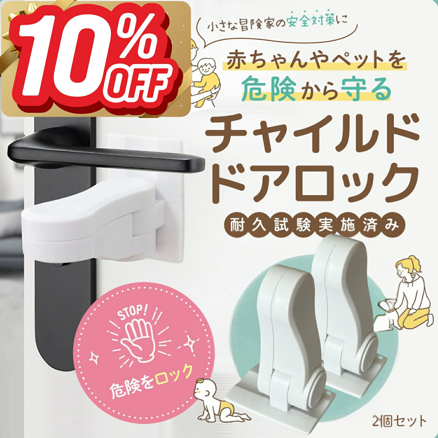 214. 配送方法選択可 ベビーガード 2個 セット ドア開け防止 ロック ストッパー ドアハンドル固定 怪我 事故 予防 子供 勝手 外出 防止 tecc-kaigolock 介護 [メール便発送/代引不可] ドアハンドルロックはハンドルの移動範囲を限定する事により、 ドアを開けくことを予防します。 お子様は勝手にドアを開ける事が出来ませんので、部屋を出て しまう事を防止します。 ハンドルロックはテープで簡単にドアに粘着でき、強い粘着性がにより 、簡単に剥がせないので、長くご愛用頂けます。 シンプルな白い色と収納可能なデザインで、ドアに貼り付けて、 違和感無し。どんなデザインのお部屋にも合います。 ハンドルロックはほとんどのドアハンドルに対応しています。 貼り付け前に、布で設置位置をキレイに拭いてください。【送料無料】メール便での発送予定となります 1,200円 税込 送料別 カードOK レビュー7件 PCBOX78楽天市場店 ![]() | ||