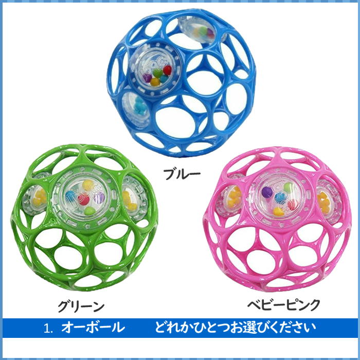 商品説明・素材 オーボールラトル+ロッツオブリンクス セット 世界で一番有名なオーボールが、いろんな用途で使える便利なロッツオブリンクスとセットになりました。 かわいいフクロウのベビーカートイ付きです♪ 1.オーボールラトル 転がしてあそぶ。振って音をならす。はじめてのボール型ラトル。 赤ちゃんが自然に握ってしまう網状のかたちでオーボールが、ラトルになりました。 振ったり、転がしたりすると、カラフルなビーズが楽しい音を響かせる、赤ちゃんのためのオーボールです。 ※「グリーン・ブルー・ベビーピンク」から一つお選びください。 2.ロッツオブリンクス 触感を刺激する24種のリングのセット。 ベビーカーにおもちゃを取り付ける時にも便利! リング単体では歯がためにもなります。 リングをつなげて遊ぶこともできます。 ★おまけ★ Bright Starts(ブライトスターツ)チャイムアロングフレンズ ふくろう おでかけをもっと楽しくするフクロウのベビーカートイです。 ゆらすと優しいチャイムの音が鳴ります♪ お子様へのちょっとしたギフトにもぴったりです。 ベビーカーやベビーキャリアなどに簡単に取り付けることができ、赤ちゃんとママのおでかけをサポートしてくれます♪ 商品情報 【対象年齢】 オーボール ラトル:0ヶ月〜 ロッツオブリンクス:0ヶ月〜 チャイムアロングフレンズ ふくろう:0ヶ月〜 【商品サイズ】 オーボール ラトル:直径10cm ロッツオブリンクス:W5×D1×H6.5cm チャイムアロングフレンズ ふくろう:W8×D6×H30cm 【備考】こちらの商品はラッピング不可となっております。予めご了承くださいませ。 ※安全のため、破損・変形したおもちゃは使用しないでください。 ※小さな部品が取れてしまった場合、速やかに処分してください。 ※実際の商品とはデザイン・仕様が異なる場合があります。 ※パソコンのモニターによって、商品の色が多少異なる場合がございます。 2,200円 税込 送料別 カードOK バルーン夢工房+ベビー ![]() | ||