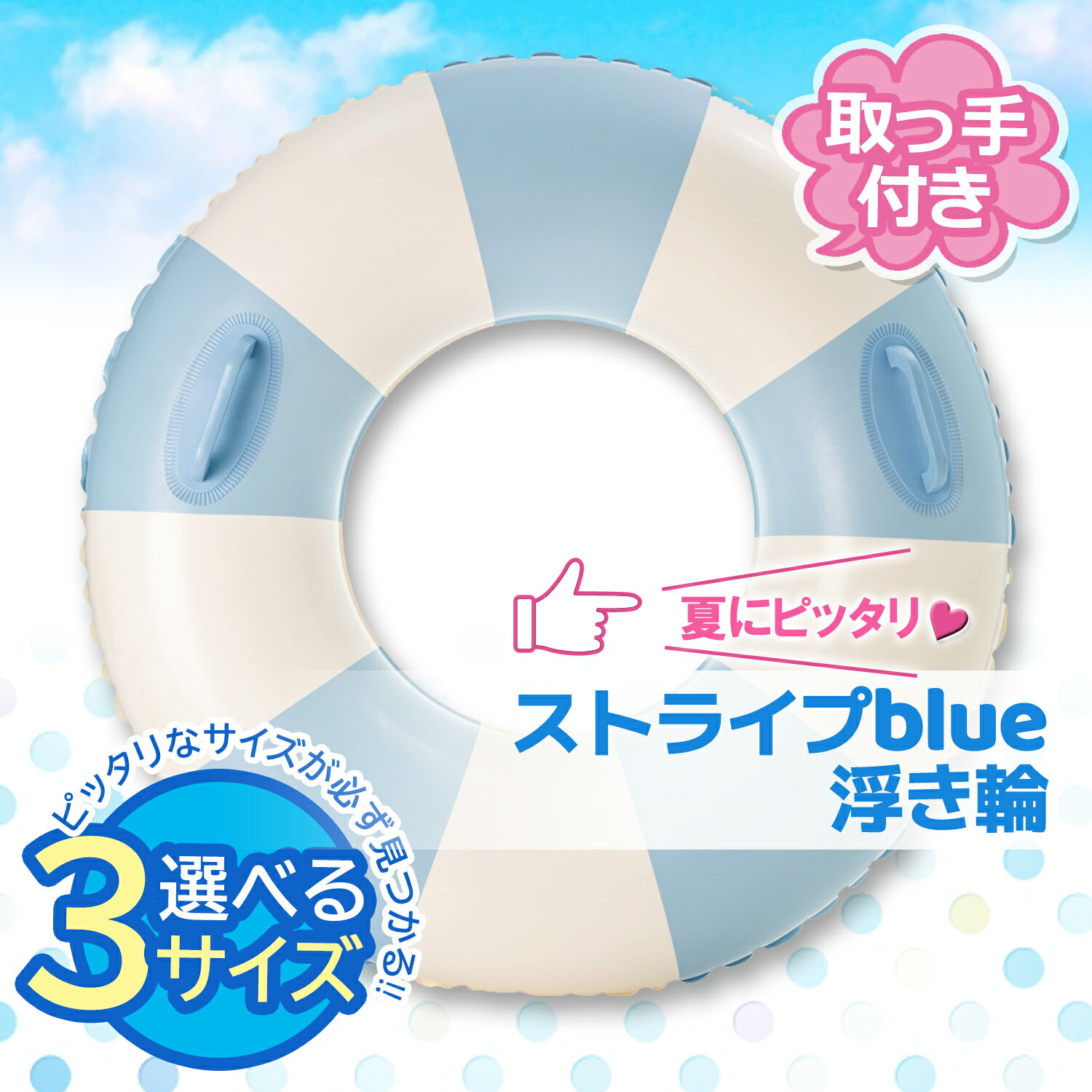 SPUエントリー +5と0のつく日はさらにお買得! ▼▼▼▼エントリーはこちら▼▼▼▼ ▲▲▲▲エントリーはこちら▲▲▲▲ 【商品説明】 ・プールや海など夏にピッタリで色鮮やかな浮き輪です。 ・シンプルでかわいいデザインなのでSNS映えすること間違いなし! ・持ち運びやすい取っ手付きです。 【商品仕様】 カラー:ストライプブルー 素材 PVC ※商品改良の為、デザインが異なる場合があります。 ※お使いの端末により、実際のカラーと異なって見える場合がございますのでご了承ください。 当店は他の販売サイトとの併売品があります。 ご注文が集中した時、システムのタイムラグにより在庫切れとなる場合があります。 その場合はご注文確定後であってもキャンセルさせて頂きますのでご了承の上ご注文下さい。 698円 税込 送料込 カードOK レビュー4件 THINK RICH STORE ![]() | ||