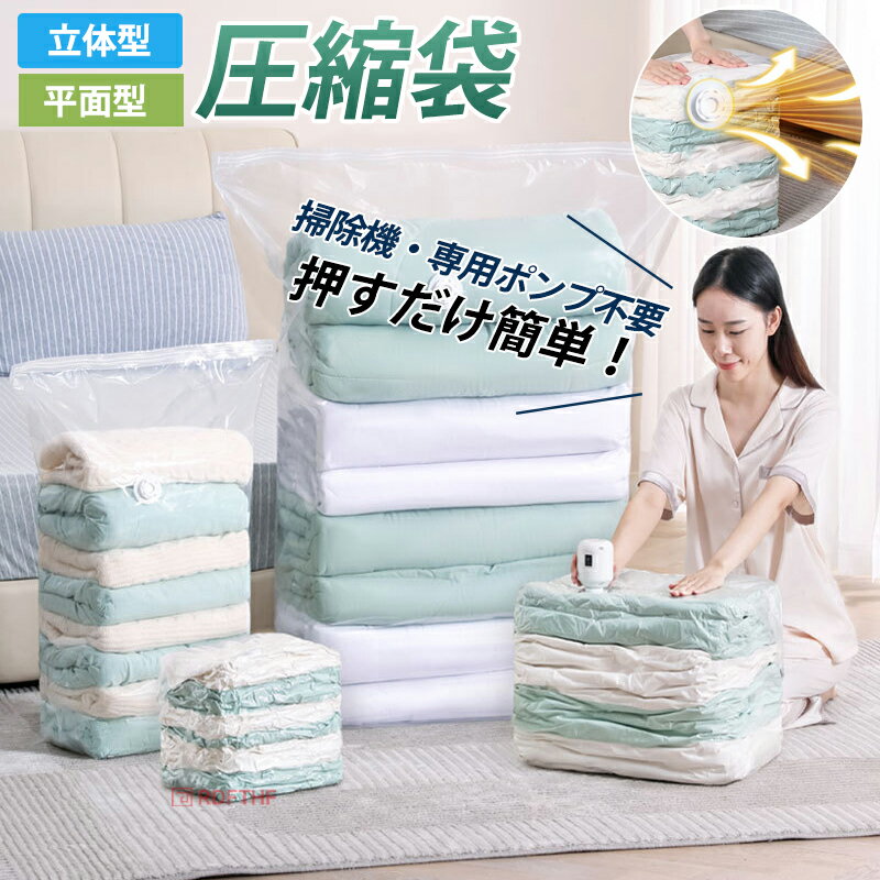 【より薄くなる】80%の圧縮率で、布団などを5分の1に圧縮できます。引っ越しや家整理整頓、来客用の布団を収納する場合に大活躍しています。ファスナーが短辺にあり、折り曲げたり丸めたりしてもファスナーが折曲らずにコンパクトに収納できます。【より多く収納】約130×100cmの大きいサイズで、毛布、ぬいぐるみ、シングルサイズの掛ふとんと敷ふとん、ダブルサイズの掛ふとんなど様々なものを楽に収納できます。スライダーが一体型の圧縮袋なので、ファスナーを閉じる際にスライダーが外れてしまわず快適に閉じられます。【より長く保存】ダブルファスナーで閉じ口が堅く閉まって空気漏れしにくいです。シリコン製の逆流防止弁も付くので空気の逆戻りがありません。一度圧縮しますと、長時間で真空状態になり、布団などをカビ、ホコリ、湿気、細菌などから守れます。4層のPE+PET素材で作られたので、破れにくくて、何度も繰り返し使えて耐久性があります。安全な素材で、ご心配なく使用できます。【より速く圧縮】バルブ式なので、掃除機のノズルをバルブ部分にあてるだけで、複数のふとんを短時間で圧縮できます。女性や年配の方でも簡単に出来上がります。ティックタイプ、ハンディタイプ、コードレスタイプなどの特殊機種の掃除機では使用できませんので、ご購入する前に確認ください。 サイズタイプ1 タイプ2 タイプ3 タイプ4 タイプ5 タイプ6サイズについての説明タイプ1:105*70cm タイプ2:145*70cm タイプ3:70*90*30cm タイプ4:80*100*40cm タイプ5:90*110*45cm タイプ6:100*120*50cm素材PE+PA色図通り備考 ●サイズ詳細等の測り方はスタッフ間で統一、徹底はしておりますが、実寸は商品によって若干の誤差(1cm〜3cm )がある場合がございますので、予めご了承ください。●製造ロットにより、細部形状の違いや、同色でも色味に多少の誤差が生じます。●パッケージは改良のため予告なく仕様を変更する場合があります。▼商品の色は、撮影時の光や、お客様のモニターの色具合などにより、実際の商品と異なる場合がございます。あらかじめ、ご了承ください。▼生地の特性上、やや匂いが強く感じられるものもございます。数日のご使用や陰干しなどで気になる匂いはほとんど感じられなくなります。▼同じ商品でも生産時期により形やサイズ、カラーに多少の誤差が生じる場合もございます。▼他店舗でも在庫を共有して販売をしている為、受注後欠品となる場合もございます。予め、ご了承お願い申し上げます。▼出荷前に全て検品を行っておりますが、万が一商品に不具合があった場合は、お問い合わせフォームまたはメールよりご連絡頂けます様お願い申し上げます。速やかに対応致しますのでご安心ください。 6,590円 税込 送料込 カードOK 松島本舗 ![]() | ||