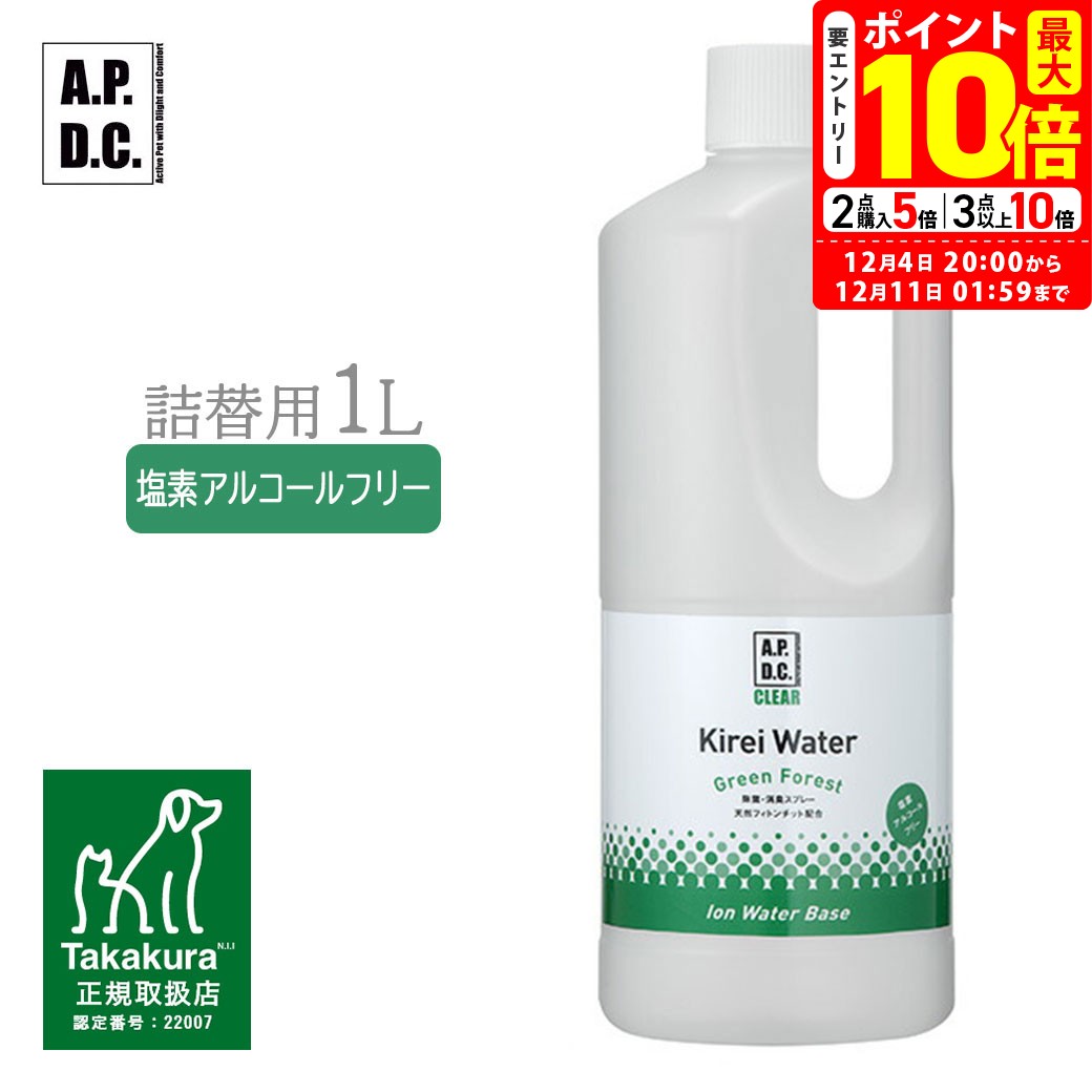 Renewalしました 商品リニューアルに伴い、2016年9月頃より、商品名、パッケージが変更となりました。 内容・成分等は一切変更ございません。予めご了承下さい。 旧商品の在庫がなくなり次第の切り替えとなりますため、お手元に届く商品がページ上のものと異なる場合もございますが、予めご了承下さい。 ページ上のパッケージ及び商品情報は、リニューアル後の商品です。 旧商品名「キレイウォーター オリジナル(kirei water for Pet)森の香り」 毎日のお手入れと、除菌・消臭がこれ1本ですべてOK! ペットのケージ、ベッド、カーペット、車の中など、臭いや汚れが気になる箇所にお使いください。 散歩後の手足の汚れ、口周りや耳、おしりまわりなど、全身のお手入れにも。 100%天然成分なので、直接身体にお使いいただけます。舐めてしまっても安全です。 ブラッシング時にも最適です。 ■適応種:全犬種、全猫種 ■製造国:日本 ■内容量:1リットル ■おすすめポイント:天然原料、舐めても安心 ■香り:森の香り、森林の香り、リラックス敏感肌のペットにも安心の天然由来成分のみ使用 確かな殺菌効果 「kirei water for Pet(キレイウォーター フォーペット)」には、植物成分と食品添加物レベルの 天然由来成分しか使用していないため、口まわりや耳、 おしり回りなどにも毎日安心してお使いいただけます。 敏感肌のペットも安心の塩素系成分・アルコール不使用。 ※すべての菌に効果があるわけではありません。 優れた消臭力 驚きの毛づや効果 ペットに直接スプレーするほか、ケージ・ベッド・毛布・ペットトイレ・車の中など、臭いが気になるところにお使いいただけます。 食品添加物レベルの複合アミノ酸を配合したことにより、被毛への高いツヤだし効果も期待できます。 毎日のブラッシングウォーターとしてもお使いいただけます。 毎日のデイリーケアをこれ一本で実現します。 キレイウォーター ラインナップ kirei waterグリーンフォレスト kirei waterシトラスミント ■香り森の香り、森林の香り、リラックス 300mlはこちら 270ml(詰替え用)はこちら 1L(詰替え用) ■香りハーブの香り、リフレッシュ 300mlはこちら 270ml(詰替え用)はこちら 1L(詰替え用) 4,290円 税込 送料込 カードOK レビュー18件 ペッツビレッジクロス ![]() | ||