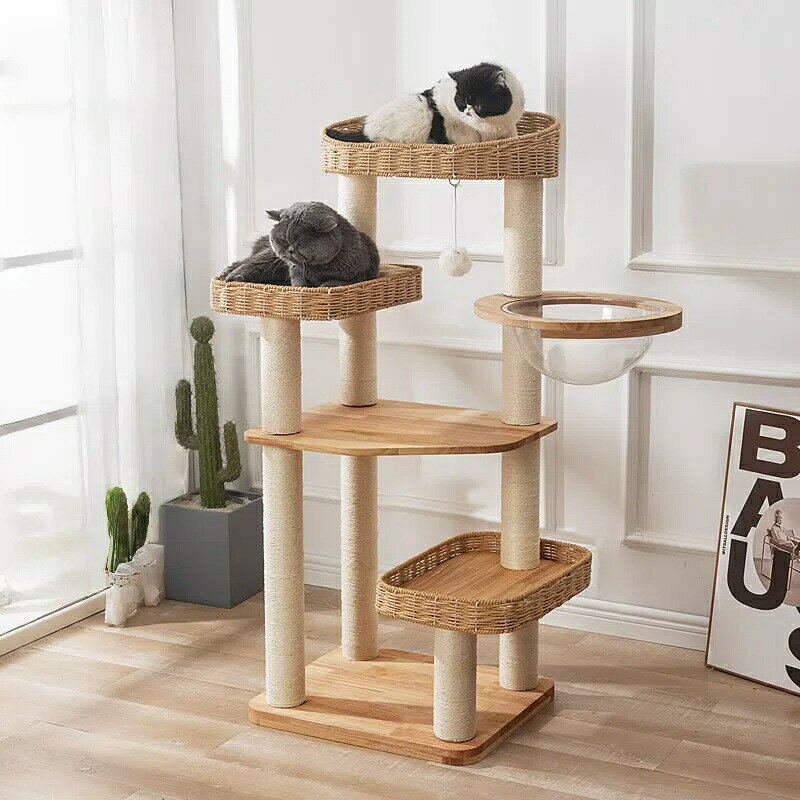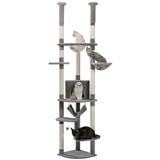 【頑丈で安定している】このキャットタワーは大型猫用に設計されており、頑丈な木製の構造を採用しています。直径12cmのサイザル麻ポールは、猫の爪とぎに最適で、家具や壁を傷つけることなく、猫が自由に爪を研ぐことができます。高さ調節可能な設計により、天井にしっかりと固定でき、安定性も抜群です。多頭飼いにも対応でき、複数の猫が同時に使用しても問題ありません。キャットツリーとして、猫の遊びと休憩場所を一つで提供します。【多機能設計】本キャットタワーには、猫の爪とぎ、登り、ジャンプ、休憩ができる多機能が詰まっています。サイザル麻のポールと広々とした展望台、宇宙船型の休憩所、さらにハンモックも完備し、猫が遊びながらリラックスできるスペースを提供。木登りが好きな猫にとっては、自宅でも思いっきり運動できる場所を提供でき、ストレス解消にも効果的です。棚板は15kgの重さにも耐えられる強度を持ち、猫の体重をしっかり支えます。【環境に優しい素材とお手入れ簡単】当キャットタワーは、高温処理された木材を使用しており、耐湿性や耐圧性が優れており、長期間使用しても形が崩れることがありません。宇宙船は水洗い可能、ハンモックの布も取り外してお手入れが簡単で、清潔に保つことができます。木の表面は湿らせた布で拭くだけでOK。お手入れが楽で、猫の健康を守りながら、安心して使える商品です。【おしゃれでインテリアに調和するデザイン】シンプルで洗練されたデザインのキャットタワーは、どんなお部屋にもマッチします。木製の優れた質感とスリムなデザインで、猫の遊び場としてはもちろん、インテリアとしても美しい空間を作ります。カラーも落ち着いたトーンで、家の中に自然に溶け込みます。猫が自由に遊べるだけでなく、おしゃれな空間を提供します。【簡単な組み立てと安心のサポート】組み立てが簡単で、設置動画が付属しており、どなたでも簡単に組み立てることができます。また、ご購入前に天井の高さをご確認いただければ、より快適にご使用いただけます。不良部品があった場合は無料で交換対応いたしますので、返品の手間も心配ありません。 ※画像はご覧になっているモニターやPCなどの環境により、実物と多少カラーが異なる場合がございます。 ※ページに記載の通りですが、製造時期や改良などによって仕様が若干異なる場合がございますので何卒ご了承下さい。 ※基本的には全国一律送料無料と対応させていただきますが、ご送付先は沖縄・北海道など離島の場合は2500円の送料をご請求させていただきます、ご注文後追加送料があります。 ※色味やサイズが異なるなどのクレームはご対応致しかねますので、ご了承ください。 ※商品のサイズは採寸方法によって、若干な誤差が生じる場合はあります。ご了承ください。 ※こちらの対応と商品について何かご不満がありましたら、「レビュー」を付ける前に一度ショップとご連絡してお願いいたします、ショップの誠意を持って最後まで対応させていただきます。 ◎※販売している商品は全て新品未使用です、倉庫から出荷前に検品必要ですので、箱を開封する場合もございます、予めご了承くださいませ。 ◎※初期不良の場合は到着後3営業日以内にご連絡ください。 ◎※初期不良の場合は写真や動画を送って下さい、確認後無料で新品交換もしくは御返金致しますのでご連絡下さい。 ◎※写真や動画を送っていただけない場合は技術者と確認できません、返品返金対応出来ない可能性が御座います、予めご了承くださいませ。【頑丈で安定している】このキャットタワーは大型猫用に設計されており、頑丈な木製の構造を採用しています。直径12cmのサイザル麻ポールは、猫の爪とぎに最適で、家具や壁を傷つけることなく、猫が自由に爪を研ぐことができます。高さ調節可能な設計により、天井にしっかりと固定でき、安定性も抜群です。多頭飼いにも対応でき、複数の猫が同時に使用しても問題ありません。キャットツリーとして、猫の遊びと休憩場所を一つで提供します。【多機能設計】本キャットタワーには、猫の爪とぎ、登り、ジャンプ、休憩ができる多機能が詰まっています。サイザル麻のポールと広々とした展望台、宇宙船型の休憩所、さらにハンモックも完備し、猫が遊びながらリラックスできるスペースを提供。木登りが好きな猫にとっては、自宅でも思いっきり運動できる場所を提供でき、ストレス解消にも効果的です。棚板は15kgの重さにも耐えられる強度を持ち、猫の体重をしっかり支えます。【環境に優しい素材とお手入れ簡単】当キャットタワーは、高温処理された木材を使用しており、耐湿性や耐圧性が優れており、長期間使用しても形が崩れることがありません。宇宙船は水洗い可能、ハンモックの布も取り外してお手入れが簡単で、清潔に保つことができます。木の表面は湿らせた布で拭くだけでOK。お手入れが楽で、猫の