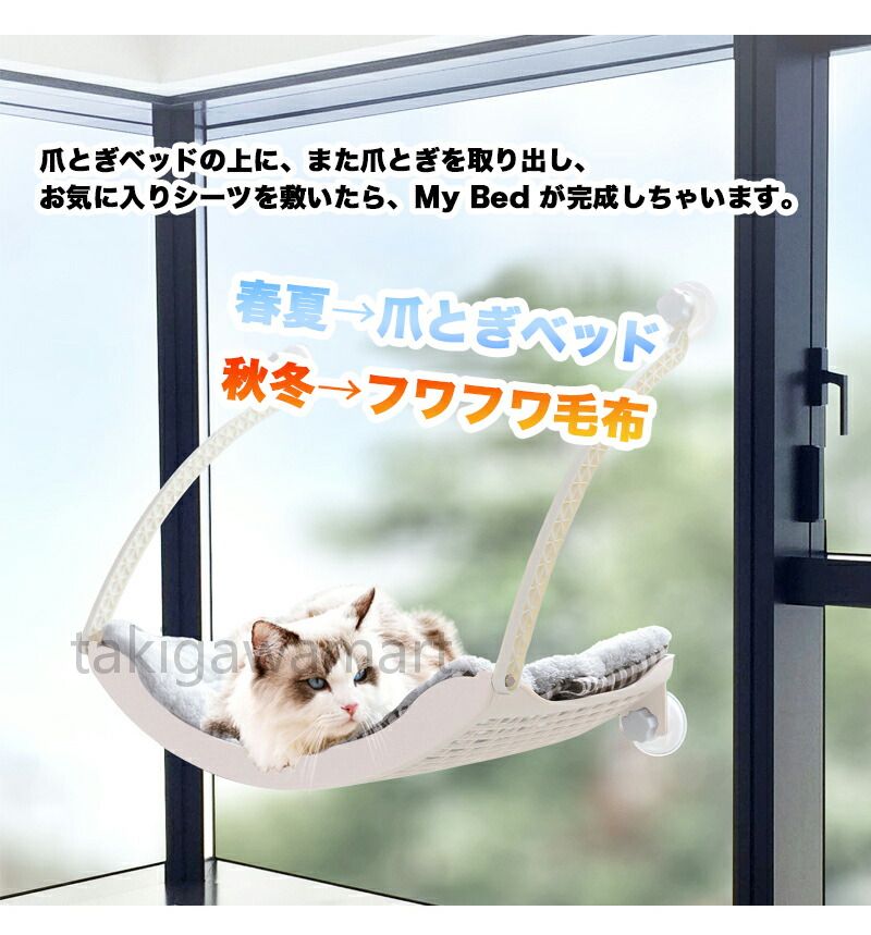 取付け方 ガラス面や壁、及び吸盤の汚れを拭き取り、乾いた状態でご使用下さい。 取り付けた後、各吸盤のボタンが緩みがあるかどうか確認して下さい。 緩みがないようにしっかり締めましょう。 ご注意 吸盤の吸着力が弱くなったり、破損・劣化が生じた場合は使用を中止して下さい。 また、本品は室内用なので、室外の使用は控えて下さい。 詳細情報 ■ サイズ 幅50.5cm×奥行き28cm ■ 耐荷重 約20kg ■ 推薦猫体重 15kg以内 ■ 付属品 ベッド本体×1、吸盤×4、爪とぎ×1 5,990円 税込 送料込 カードOK 瀧川まーと ![]() | ||