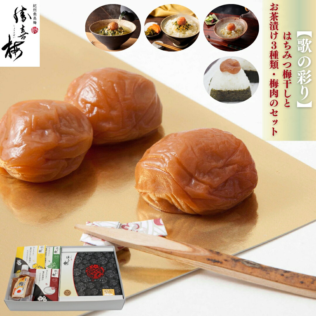1087. 歌の彩り≪はちみつ梅干しとお茶漬け3種類・梅肉のセット≫ 勝僖梅 しょうきばい ショウキバイ プレゼント 贈り物 法事 慶事 手土産 挨拶 ごはんのおとも お取り寄せ はちみつ梅 お歳暮 内祝 お返し 「紀州南高梅」の中でも厳選された「特A級」の梅干しだけを使用 。 勝僖梅で一番人気のお味、はちみつ仕立ての梅干しとお茶漬け3種類、梅肉が入った嬉しいギフト。 お茶漬けにセットしている梅干しは、ごはんによく合う勝僖梅自慢の「甘仕立て」。 あとのせで本格的な梅茶漬けがあっという間に出来上がります。 梅干し:はちみつ仕立て(塩分約8%) 「甘仕立て」に国産はちみつを加え、更にまろやかに仕上げました。 さっぱりとしたはちみつの甘さが、ほどよく塩分と酸味を取り除いた梅... 5,400円 税込 送料別 カードOK 勝僖梅 楽天市場店 ![]() | ||