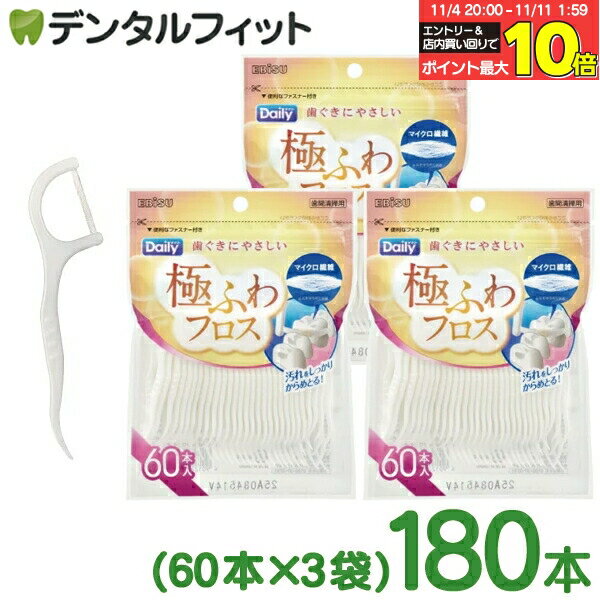 エビス Daily 極ふわフロス 60本入 歯ぐきにやさしい素材 ふわふわの繊維状フロスだから 歯ぐきにやさしく、 歯間の歯垢をしっかりからめとる。 ※イラストは全てイメージ図です。 【使用方法】 フロスを前後に動かしながら歯と歯の間にゆっくりと挿入します。 片方の歯面に沿わせながらフロスを 上下させ歯垢を取り除きます。 もう一方の歯面も同様に取り除いてください。 【材質】 柄の材質:ポリスチレン フロス(糸)の材質:ポリエステル 耐熱?度:180度 【使用上の注意】 ●使用前にをよく読み、使用中は捨てずに保管してください。 ●歯や歯ぐきを傷付けるおそれ がありますので、無理に挿入しないでください。 ●フロスが引っかかるほど狭い歯間で使用しないでください。柄からフロスが抜けたり切れたりする場合があります。 ●使用中、 痛みや異常を感じた場合は使用を中止し、歯科医師に相談してください。フロスが歯に引っかかったり切れやすい時は、歯の詰め物が取れていたり、むし歯のおそれもありますので、歯科医師に相談してください。 ●歯間清掃以外の用途に使用しないでください。 ●衛生上、本商品1本につき1回の使用をおすすめします。 ●お子さまの手の届かない所に保管してください。 【ご注意(免責)事項】当店では、サイト上に最新の商品情報を掲載するよう努めておりますが、メーカーの都合等により、商品規格や仕様(容量・成分・パッケージ・原産国など)が予告なく変更される場合がございます。このため、実際にお届けする商品と商品ページ上の情報表記が異なる場合がございますので、ご使用前には必ずお届けした商品の商品ラベルや注意書きをご確認ください。また、商品情報についてページ表記以外の詳細が必要な場合は、メーカー等にお問合せください。 1,000円 税込 送料別 カードOK レビュー1件 歯科医院専売品のデンタルフィット ![]() | ||