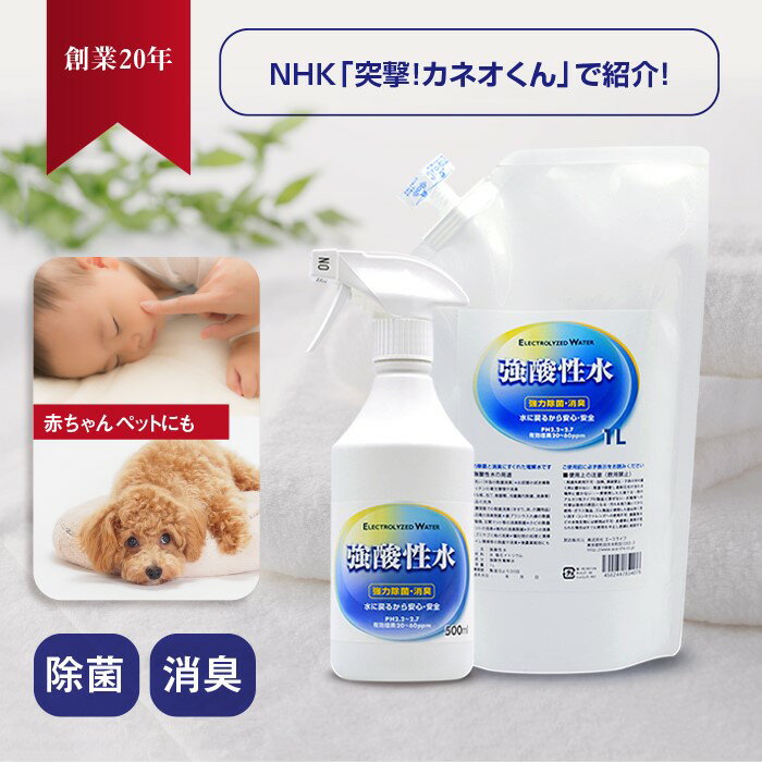 ※強酸性電解水(次亜塩素酸水の学術名)は水酸化ナトリウムを含まない本物のHClO(次亜塩素酸)水です。 ◆送料込みのお得な500mlボトルと1Lの推奨セットです。 強酸性水(強酸性電解水)を満足に使いたい方はこちら。 薬品を使わずに塩水を電気分解して得られる強酸性水は 使用後に水に戻るため人体や環境に優しい水溶液です。 化学薬品不使用でありながら消毒用エタノールよりも優れた除菌と 消臭効果があることから医療現場や介護施設でも活躍中。 その「強酸性水」を家庭や職場で手軽にお使い頂くために 出来たての新鮮な状態でお届けします。 日常生活での衛生管理やペットのお手入れ、家庭内の嫌な臭いもこれ1本で解決! 希釈せずに使えるので肌にも安心で便利です。 また耐性が出来ない特性から医療現場等でのさらなる活躍が期待されています。 ※出荷時 有効塩素濃度57ppm(北里環境科学センター調べ) 消費期限 常温1ヶ月 冷蔵 3ヶ月 塩分を含まない機器(2隔膜3室型)で生成。 塩分を含む強酸性水に比べて長持ちします。 ◆ 2020年4月放送のNHK「突撃!カネオくん」で歯科治療時のうがい液や最新プールにも使用されている電解次亜塩素酸水の家庭用として当商品が紹介されました。 受注生産だから無駄に作り置きすることはなく、プラスチック削減にも貢献!商品も水に戻る事からとてもサステナブルです。 強酸性水についての疑問や不安などお問い合わせ下さい。 ※仕様・外観・販売価格は予告なしに変更することがありますのでご了承下さい。 レターパックでの配送となりますので、受け取り時にサインが必要となります。■注意事項 強酸性水の類似品にご注意ください ● 強酸性電解水ではないもの 塩素濃度が高い次亜塩素酸水は 「次亜塩素酸ナトリウム」を水で薄め塩酸やクエン酸などの酸性物に混ぜている 混合型という商品があります。こちらの商品は、苛性ソーダを含むため 強酸性水(強酸性電解水)とは同等ではありませんので、同じ使い方はお勧めできません。 類似品にご注意ください。 詳しくは当社HPブログ「次亜塩素酸水と次亜塩素酸ナトリウムの違い」を参照 ● 一般的な強酸性水 一般的な2室型の機械で作られる強酸性水は塩が残ってしまっているタイプです。 塩が残ってしまっている強酸性水を農薬に使用すると翌年塩害が発生する可能性があります。 塩害を発生させない為には、塩を含まないように設計された機械(2隔膜3室型) で生成された強酸性水をお勧め致します。 また塩が残ってしまっている一般の強酸性水は10日ほどで成分の次亜塩素酸が無くなって しまいます。しかし次亜塩素酸がイオン化されたものしか含まない2隔膜3室型のタイプ では1 ヶ月以上は持つことが確認されています。 強酸性水 ご使用上の注意( 飲用禁止) ● 用途外使用不可 ● 加熱、冷凍禁止 ● 子供の手の届く所に置かない ● 常温で保管し直射日光の当たる場所に置かない● 他のアルカリ性タイプの製品と混ぜない ● 衣類への付着は脱色の原因となる● 汚れを取り除いてから使用する ● コンタクトレンズへの使用不可 ● ガラス製品、ゴム製品に使用した後は良く洗い流す● 観賞魚などの水性生物には使用不可 ● 対象物の有機物などの汚れを予め落としてから使用すること ● 皮膚に異常が見られた場合はすぐに使用を中止し医師に相談してください ● 安全性は十分確認しておりますが使用方法につきましては自己責任となります 注意事項 品名:強酸性水 原材料:水 塩化ナトリウム [常温出荷時]pH:2.7 有効塩素濃度:57ppm [常温1ヶ月後]pH:2.68 有効塩素濃度:45ppm [常温3ヶ月後]pH:2.71 有効塩素濃度:33ppm [冷蔵保存出荷時]pH:2.68 有効塩素濃度:57ppm [冷蔵保存3ヶ月後]pH:2.69 有効塩素濃度:47ppm ※検査機関:北里環境科学センター 検査番号:北化初 2020-0037 すべて500mlスプレーボトルの新品未開封検査となります。 製造販売元 株式会社 エースライフ 3,980円 税込 送料込 カードOK レビュー25件 エースライフ 楽天市場店 ![]() | ||