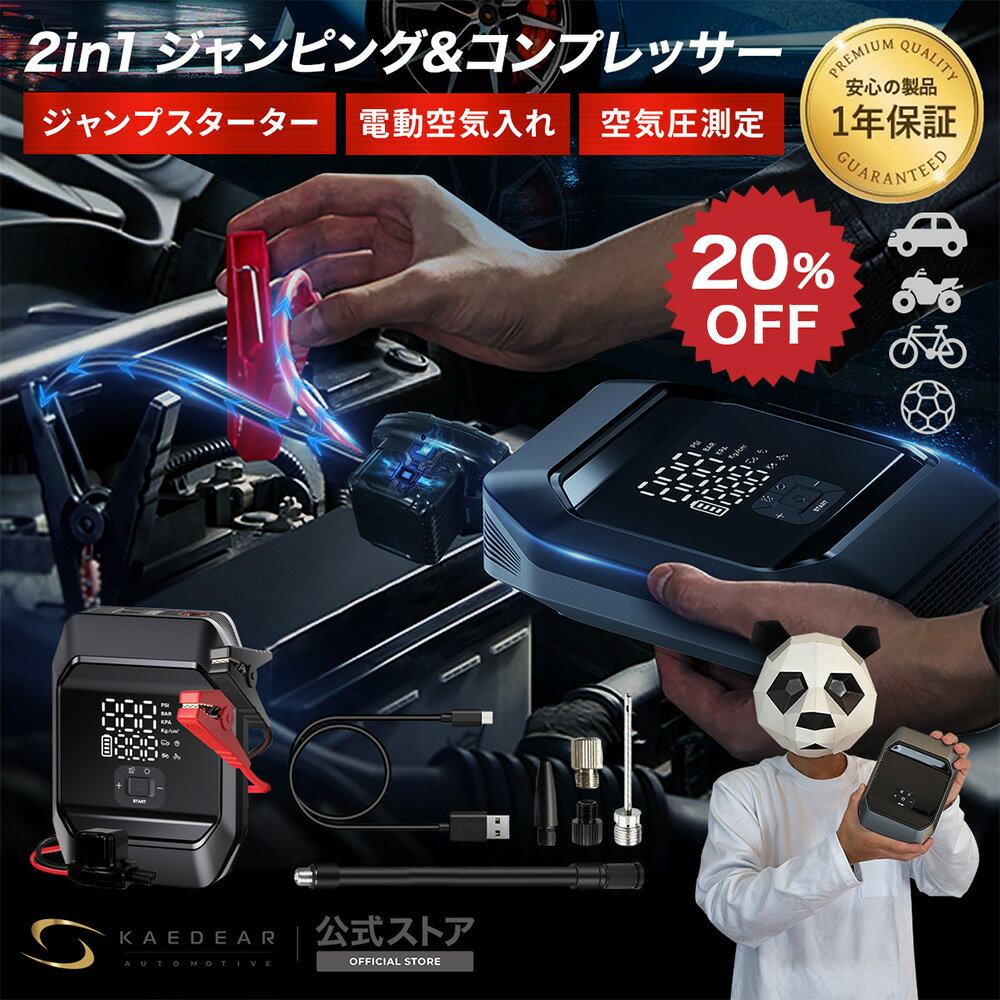 商品情報 2in1ジャンピング&コンプレッサー タイヤの空気圧調整とバッテリー上がり時のジャンプスターターの2つの機能を持ち合わせる充電式電動エアーポンプ&ジャンピングスターター。空気圧調整が自宅やドライブ先で手軽に行え、万一バッテリー上がりが発生した場合もエンジンを始動させることができます。バイクのジャンピングや自転車の空気入れとしてもご使用頂けます。※ハイブリッド車のジャンピング可否はメーカーの指示に従ってください。 商品仕様 ■電池容量:37Wh(10,000mAh) ■吐出量:30L/min ■ジャンピングピーク電流:1000A(12Vガソリン車4.0L以下/ディーゼル車2.5L以下) ■入力:5V2A / 9V2A / 12V2A / 15V2A / 20V2A(Type-C) ■空気圧単位:PSI、BAR、KPA、Kg/cm² ■空気圧上限:最大999KPA(約145PSI) ■USB出力:5V2.4A ■サイズ:長さ180mm、横幅130mm、厚み58mm ■重量:約732g ■使用温度範囲:-10〜45℃ ■連続稼働時間:10分以内 商品内容 本体、エアーホース(米式バルブ)、仏式バルブアダプター、英式バルブアダプター、ボールニードル、浮き輪ノズル、ブースターケーブル、充電ケーブル、収納袋■取扱説明書(オンラインのみ):環境負荷の軽減を目指した脱炭素化への取り組みとして、紙媒体での同封を控えさせていただいております。Kaedear公式サイトの各商品ページから閲覧またはダウンロードが可能です。■サイズ:長さ180mm、横幅130mm、厚み58mm、重さ:732g 注意事項 ・タンクを持たない直結型のため、タイヤのビート上げには適しません。 ・24V車には使用できません。 ・タイヤバルブやバッテリー端子の位置によってはホースやクランプが届かない場合があります。 ・高温になるため、10分以上の連続使用はお控えください。 ・ジャンピング機能はバッテリー残量50%以上でご使用ください。 ・ジャンピング不可の際はインジケーターが赤点灯し、接続不良やバッテリー破損の可能性があります。 メーカー保証 ■メーカー保証期間:1年(ご購入日と同日が期限)カエディアではお客様にご満足頂ける様、販売後もサポートさせて頂きます。商品のご不明な点はもちろん、バイクへのお取り付けに関するご相談は、国家整備資格を保有したスタッフがおりますので、専門知識に対しても的確に対応させて頂きます。万一、製品不良に起因する不具合と診断される場合は、弊社のメーカー保証規定に基づき審議させて頂き、メーカー保証による無償での修理、交換を行わせて頂きます。業務用に使用される際は、メーカー保証期間を半分の期間とさせて頂きます(例:メーカー保証期間が1年の場合、6ヶ月となり、ご購入日の月に6ヶ月を加算した同日が期限)。詳細は公式サイト内メーカー保証規定をご覧下さい。お取り付け後、ご使用後でも、対応させて頂きます。日本メーカーとして、おもてなしの心で対応致します。先ずはお気軽にご相談下さい。 KaedearのAir シリーズ KaedearのAir シリーズ 別売り L字バルブ コンパクト軽量リーズナブル パワフル コンパクト モバイルバッテリー機能 パワフル 車向き コンパクト 充電機能付き 超パワフル ジャンプスターター 充電機能付き 超パワフル 車向き ジャンプスターター 電動空気入れ特殊ページ 用途別 詳しくはこちら >> [参考キーワード] バッテリーチャージャー 車 車載用 車載 車用 バイク用 エンジン バッテリー ジャンプスターター バッテリー上がり バイクバッテリー 充電器 ジャンプ スターター エンジンスターター ブースター 携帯 LED応急ライト LED ジャンプスターター モバイル コンプレッサー コンプレッサー ジャンピングスターター エアコンプレッサー[参考キーワード] 車 車載用 車載 車用 バイク用 エンジン バッテリー ジャンプスターター バッテリー上がり バイクバッテリー 充電器 ジャンプ スターター エンジンスターター ブースター 携帯 LED応急ライト LED ジャンプスターター モバイル コンプレッサー コンプレッサー ジャンピングスターター エアコンプレッサー 12,980円 税込 送料込 カードOK レビュー68件 株式会社 Kaedear ![]() | ||